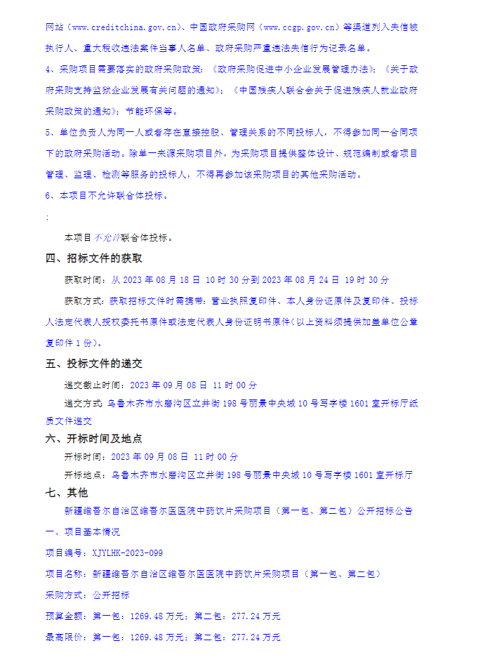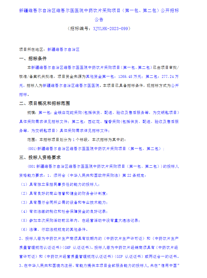 【新疆维吾尔自治区维吾尔医医院】新疆维吾尔自治区维吾尔医医院中药饮片采购项目(第一包、第二包)公开招标公告