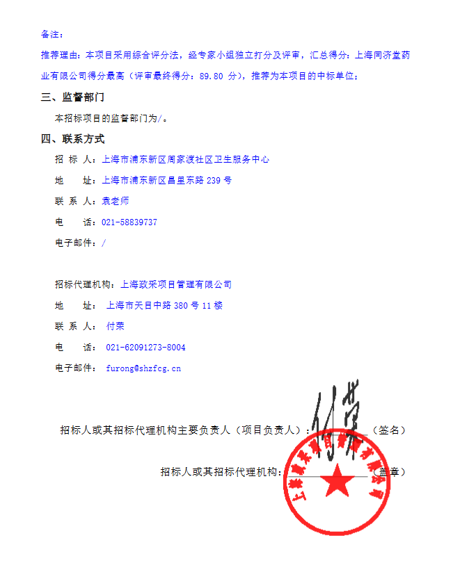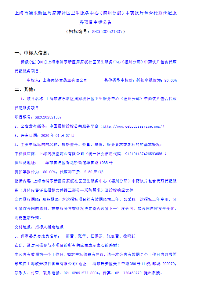 【上海市浦东新区周家渡社区卫生服务中心】上海市浦东新区周家渡社区卫生服务中心(德州分部)中药饮片包含代煎代配服务项目中标公告