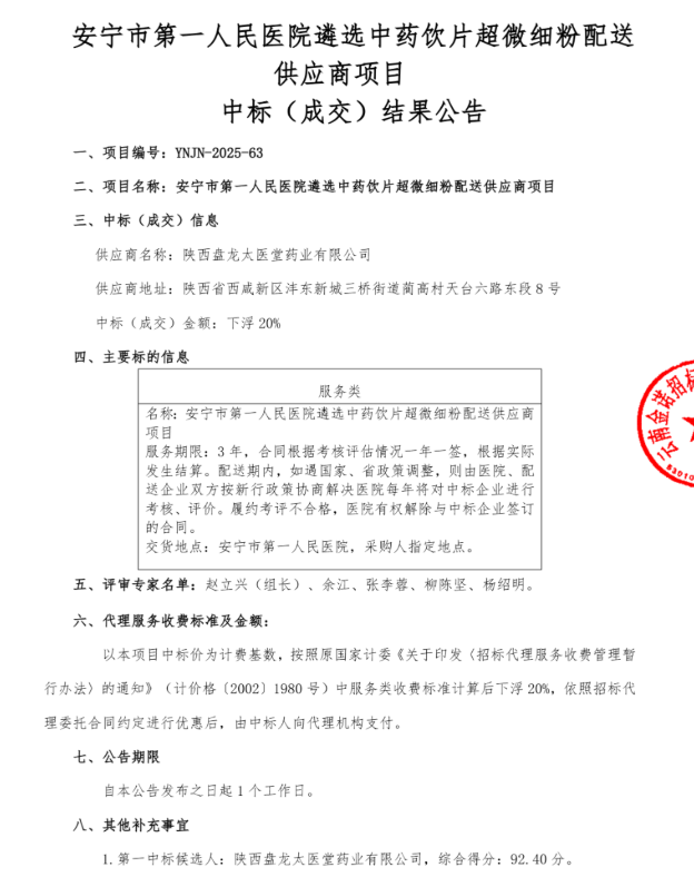 【昆明市安宁市第一人民医院】云南省安宁市第一人民医院遴选中药饮片超微细粉配送供应商项目中标结果公告