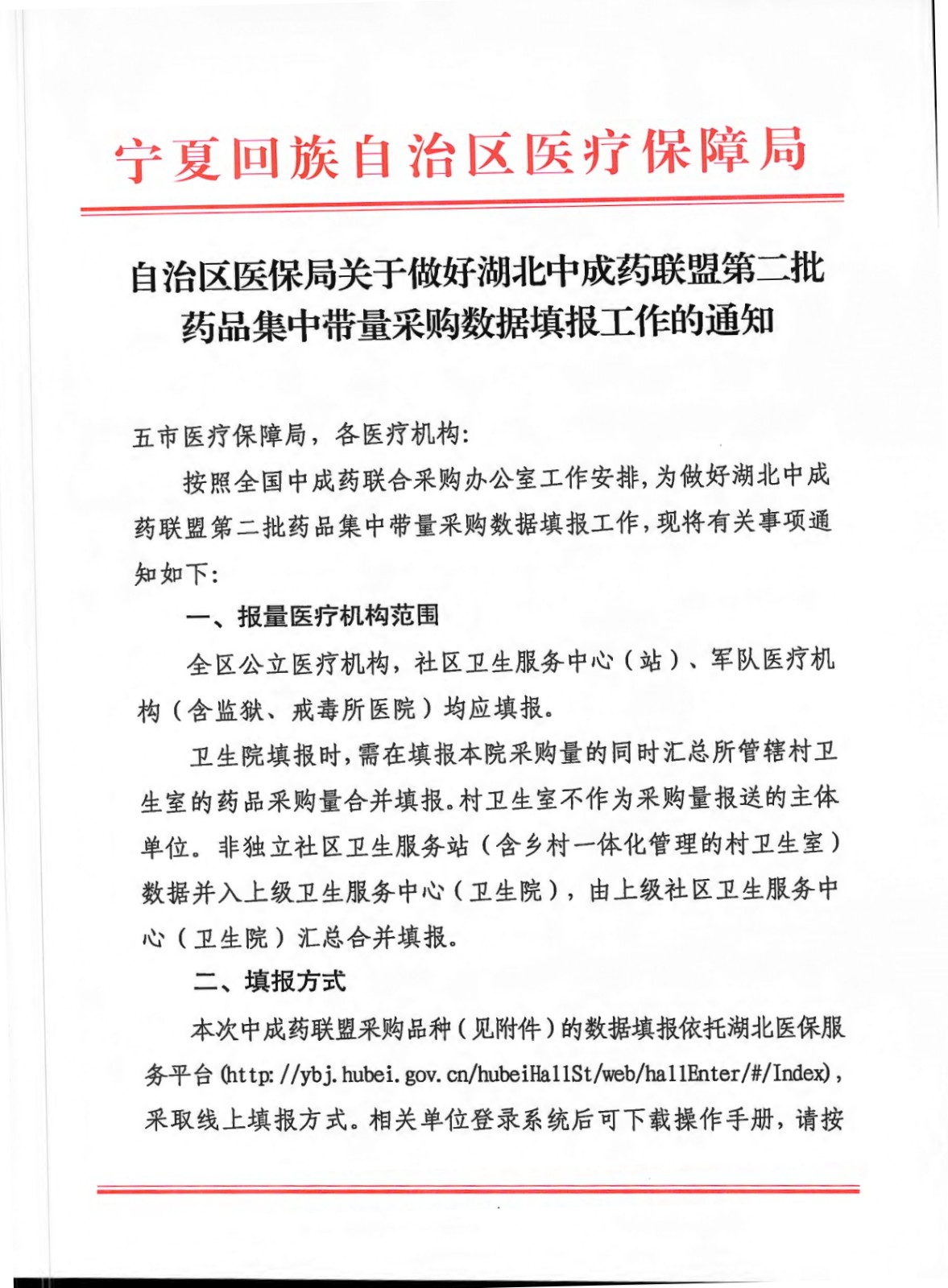 【宁夏】转发《自治区医保局关于做好湖北中成药联盟第二批药品集中带量采购数据填报工作的通知》