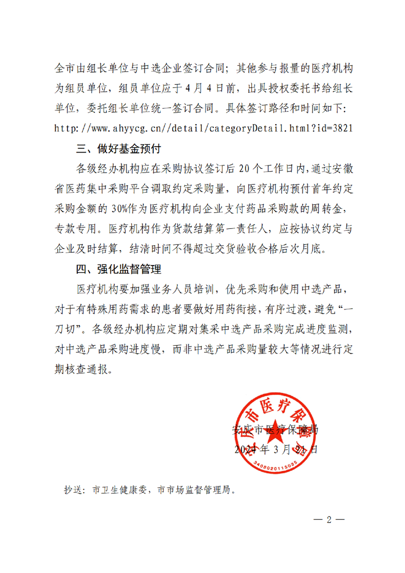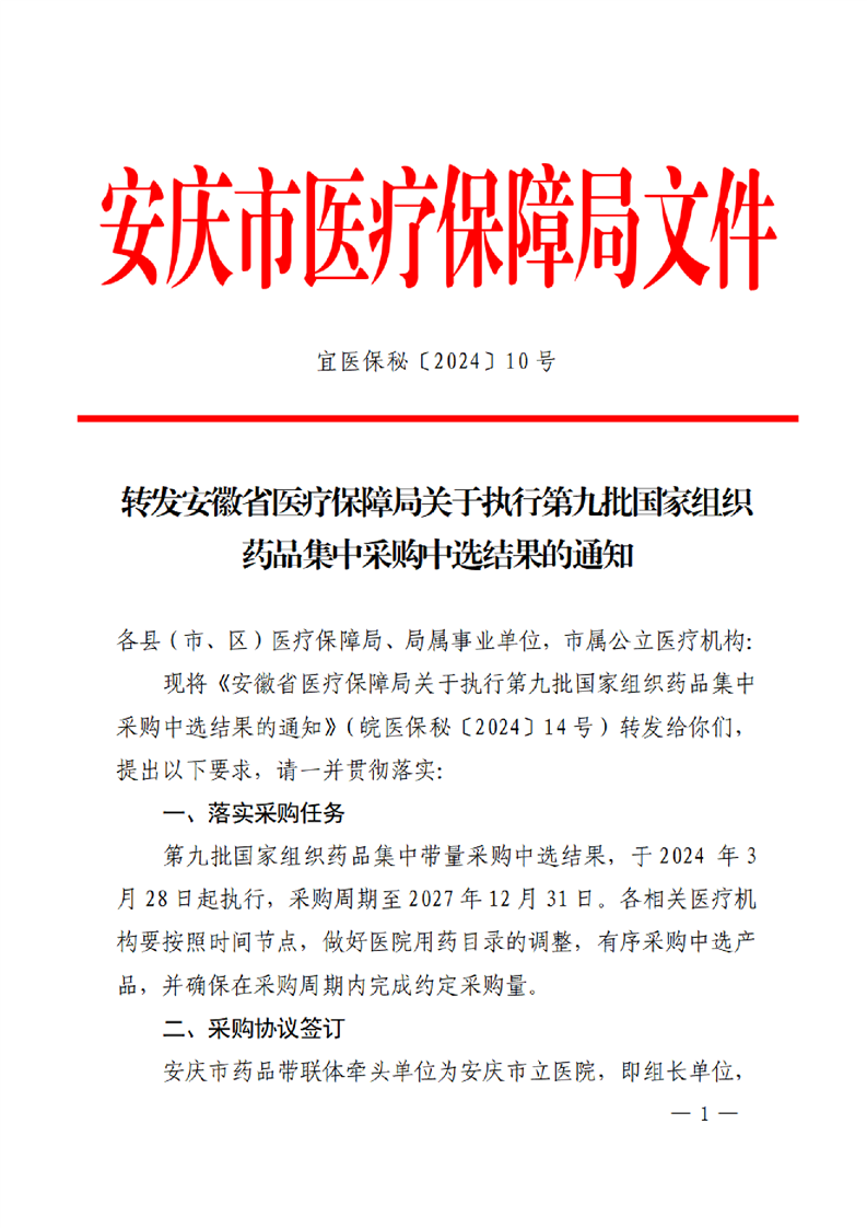 【安庆】转发安徽省医疗保障局关于执行第九批国家组织药品集中采购中选结果的通知宜医保秘〔2024〕10号