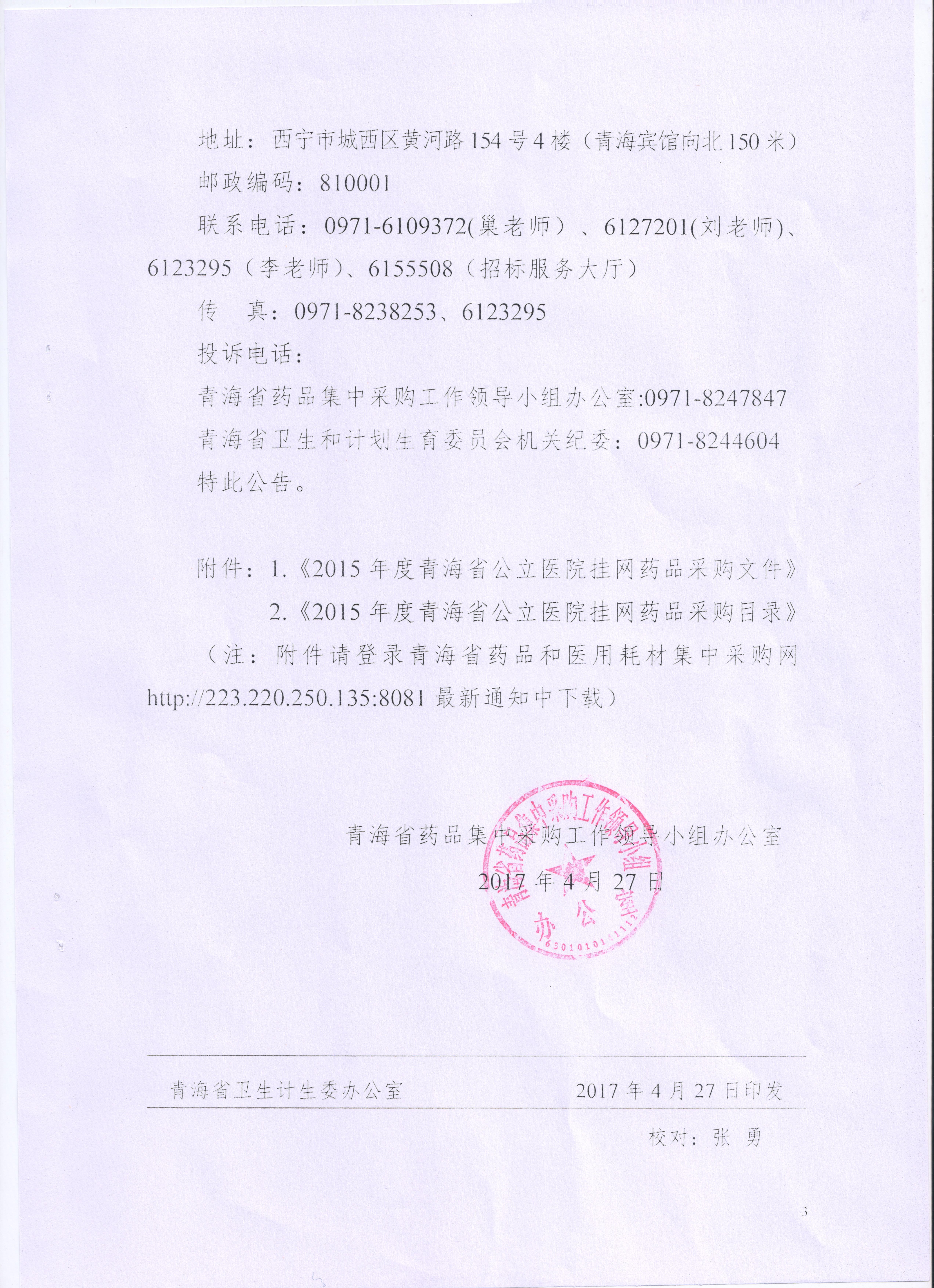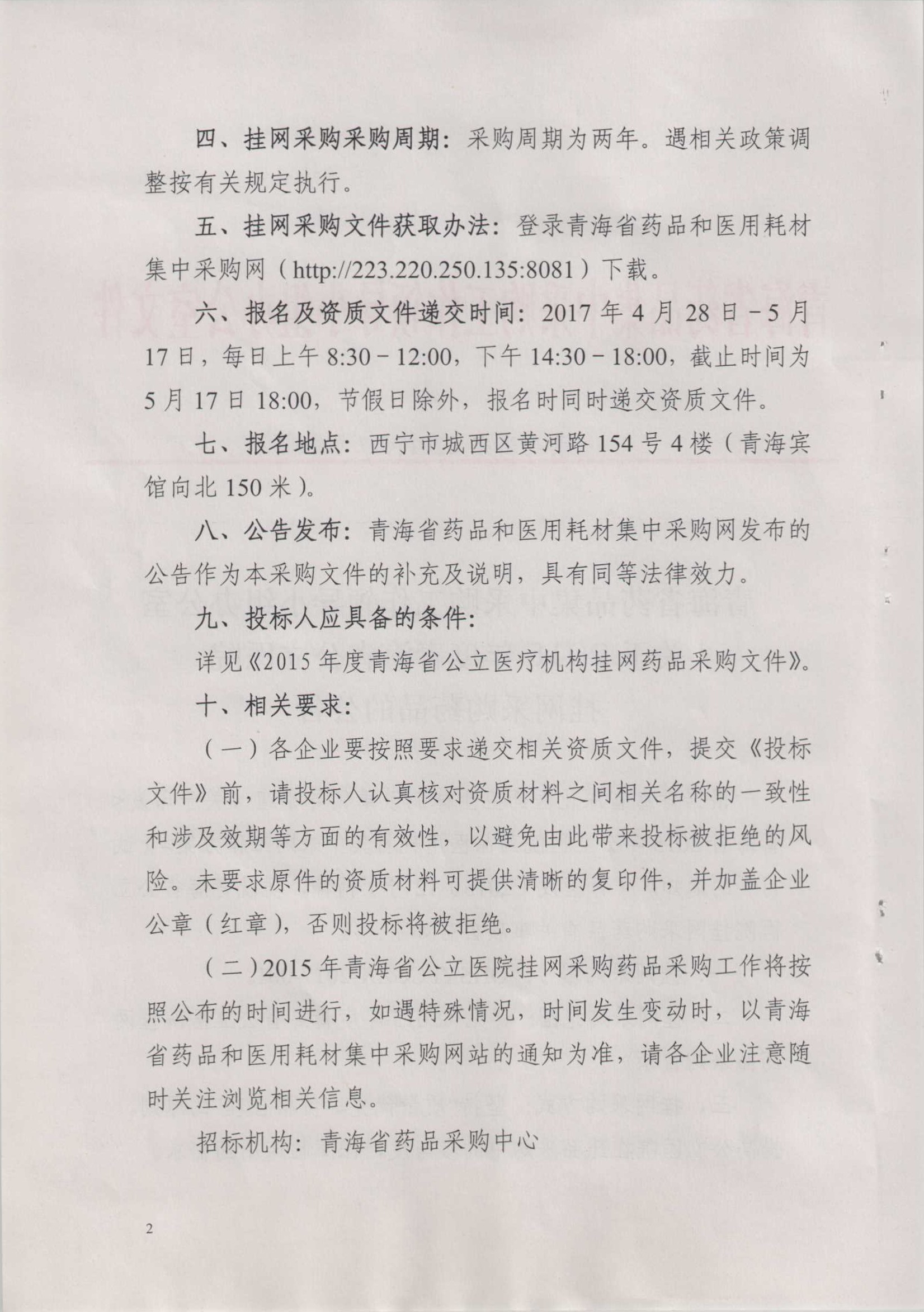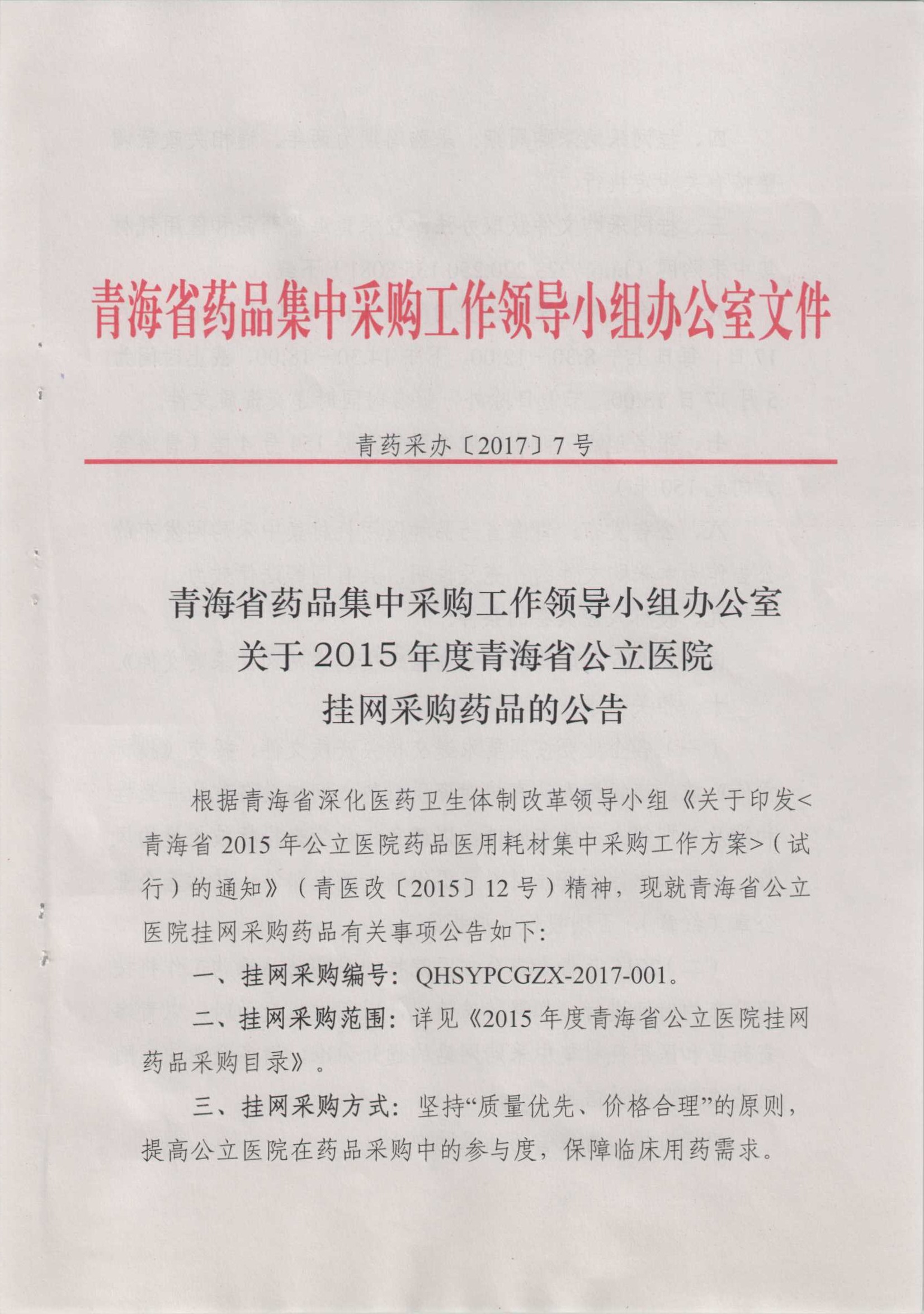 【青海】青海省药品集中采购工作领导小组办公室关于2015年度青海省公立医院挂网采购药品的公告