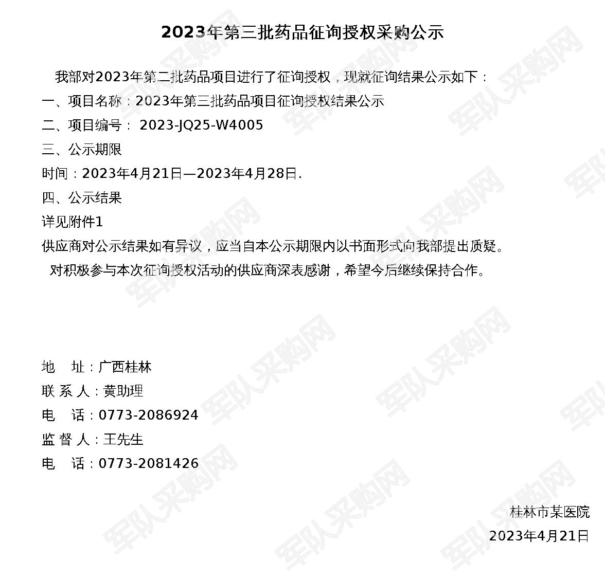 【军队采购】军队采购网2023年第三批药品征询授权采购公示(2023-JQ25-W4005)