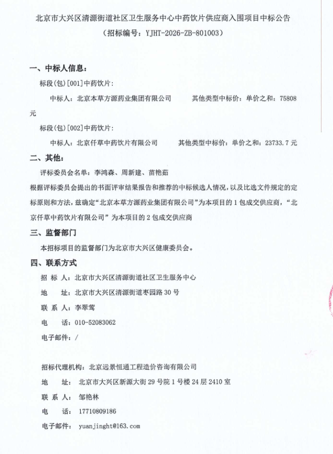 【北京市大兴区清源街道社区卫生服务中心】北京市大兴区清源街道社区卫生服务中心中药饮片供应商入围项目中标公告