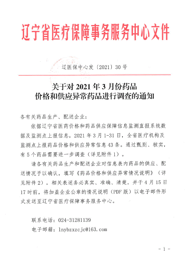 【辽宁】辽宁省关于对2021年3月份药品价格和供应异常药品进行调查的通知