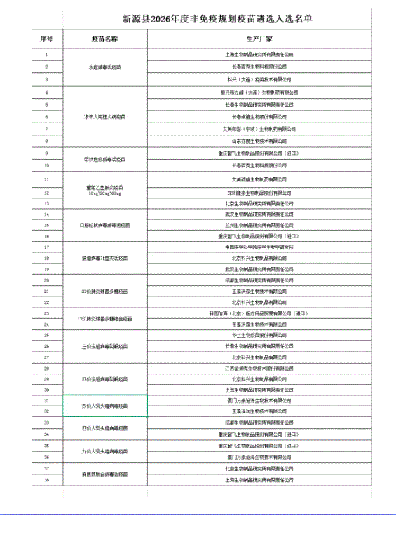 按照新源县2026年非免疫规划疫苗遴选要求,现将遴选结果公示如下: