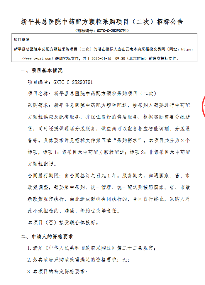 【玉溪市新平县总医院】云南省〔新平县总医院中药配方颗粒采购项目(二次)〕招标公告