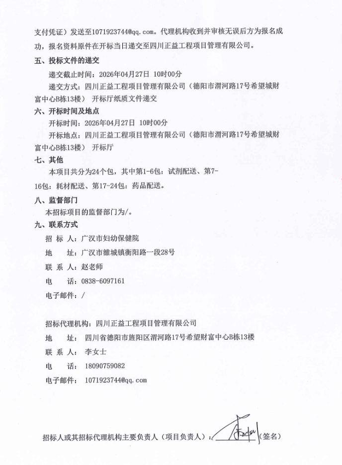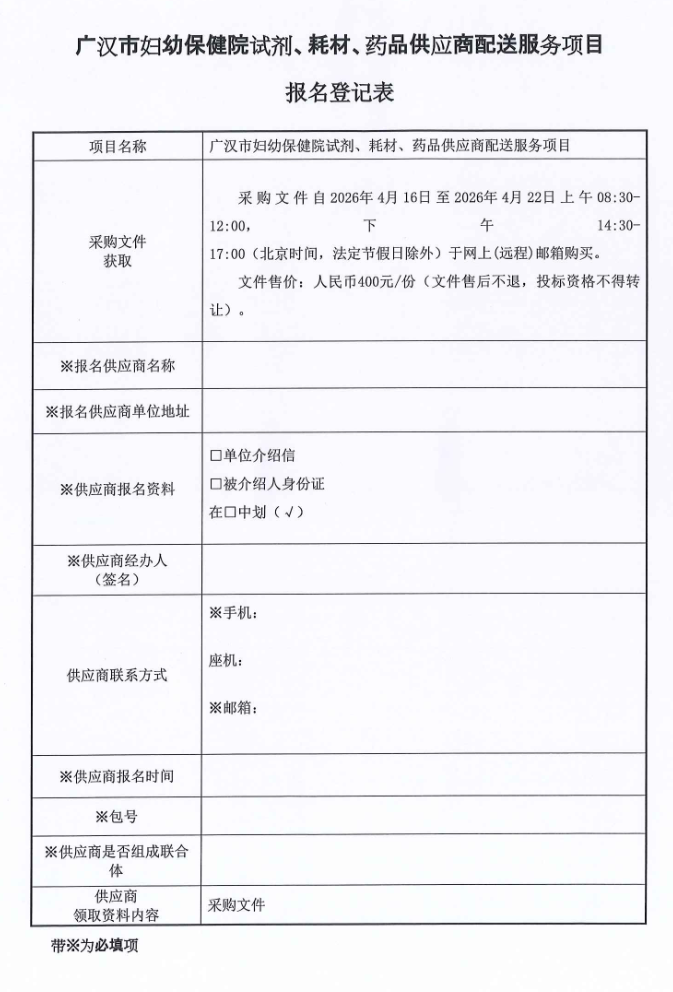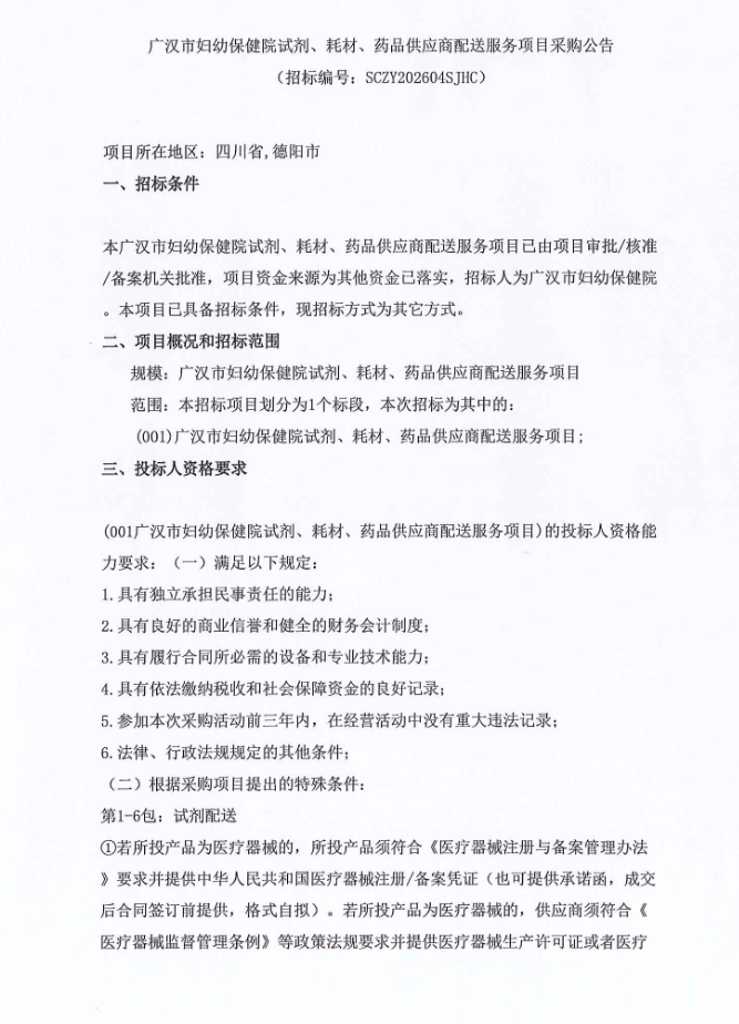 【德阳市广汉市妇幼保健院】四川省广汉市妇幼保健院试剂、耗材、药品供应商配送服务项目采购公告