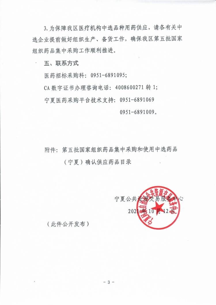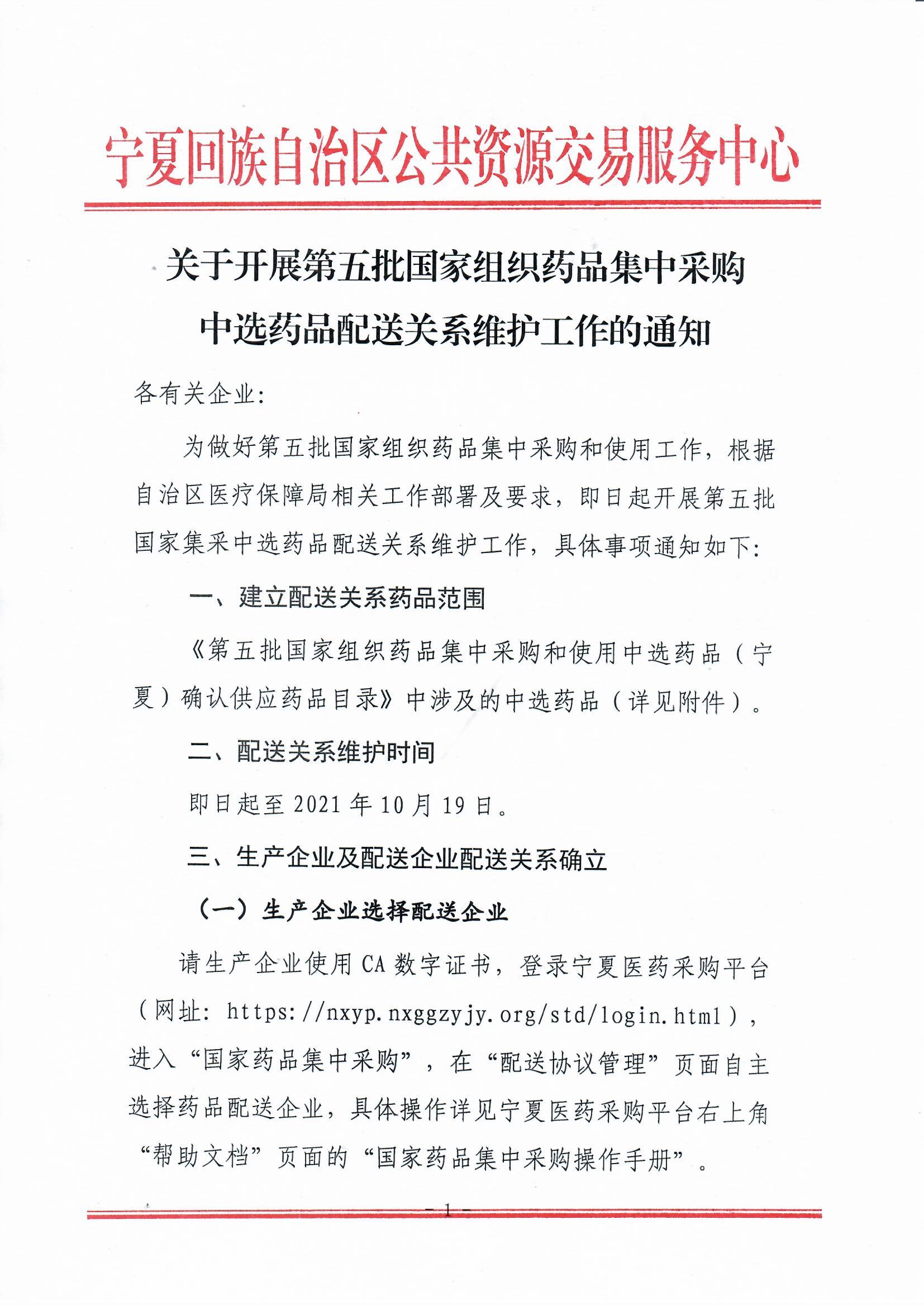 【宁夏】宁夏回族自治区关于开展第五批国家组织药品集中采购中选药品配送关系维护工作的通知