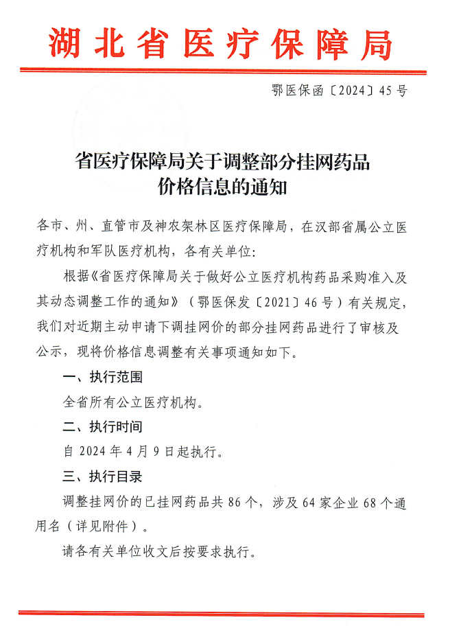 【鄂州】省医保局关于调整部分挂网药品价格信息的通知(鄂医保函【2024】45号)