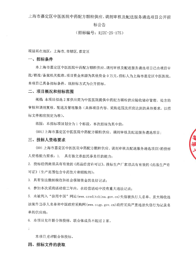 【上海市嘉定区中医医院】上海市嘉定区中医医院中药配方颗粒供应、调剂审核及配送服务遴选项目公开招标公告