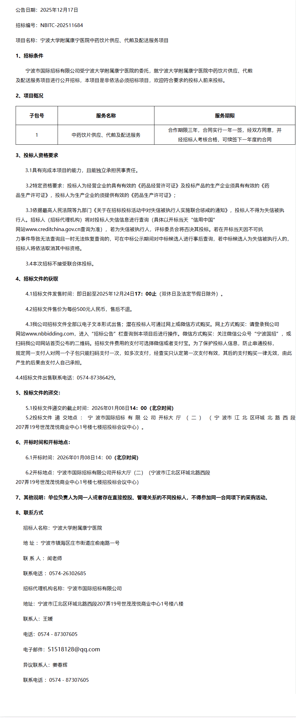 【宁波大学附属康宁医院】浙江省宁波大学附属康宁医院中药饮片供应、代煎及配送服务项目招标公告