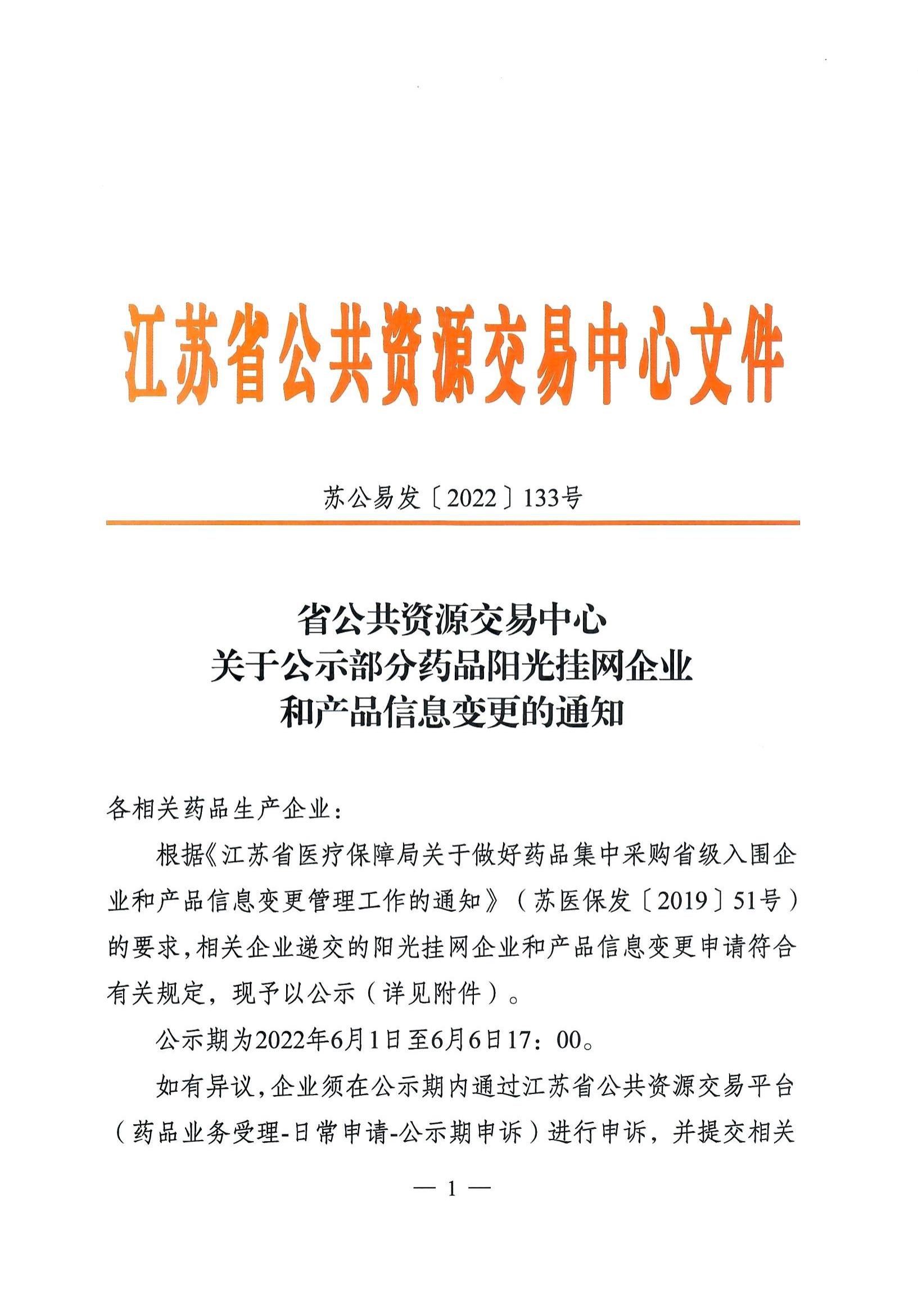 【江苏】省公共资源交易中心关于公示部分药品阳光挂网企业和产品信息变更的通知