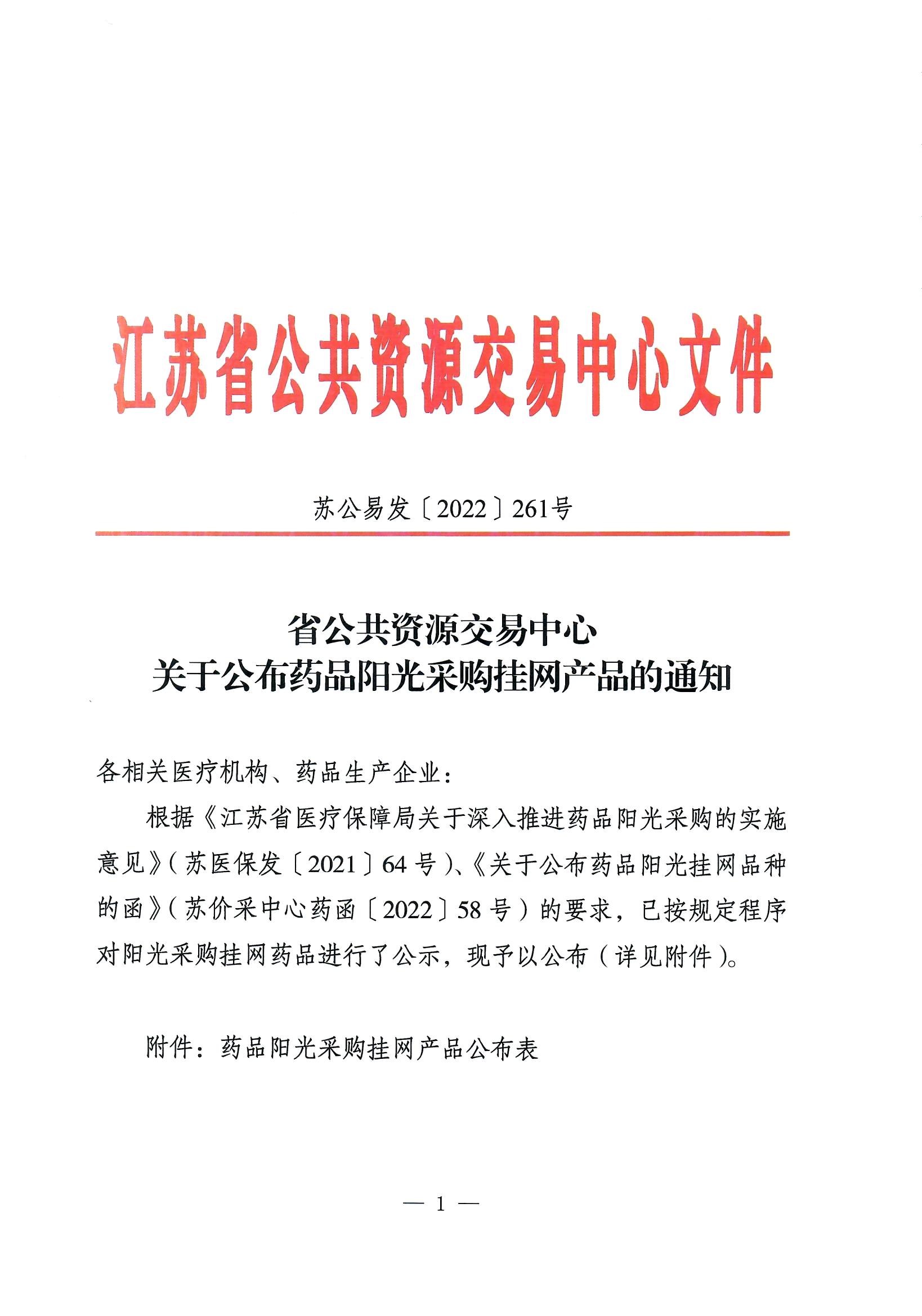 【江苏】省公共资源交易中心关于公布药品阳光采购挂网产品的通知
