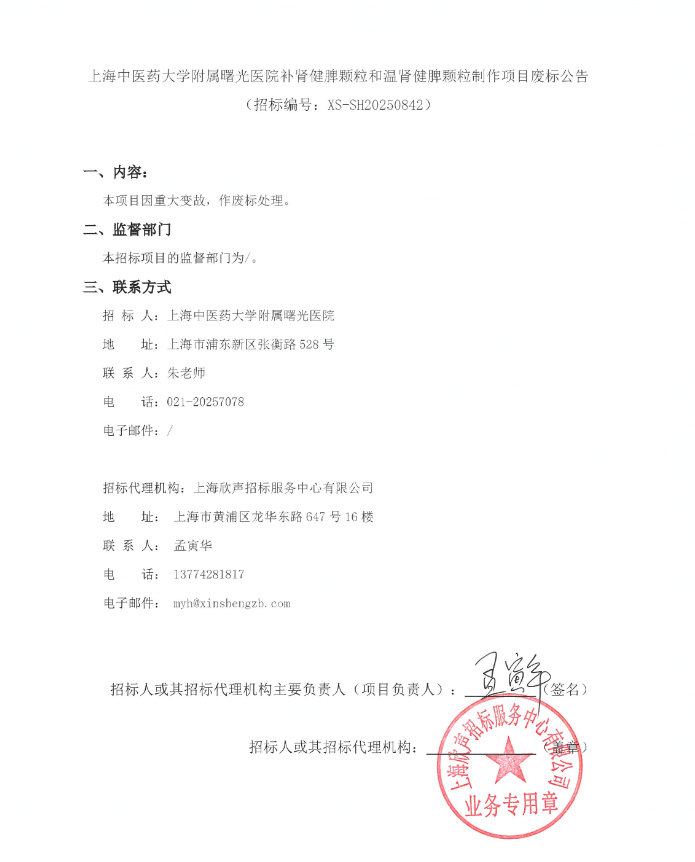 【上海中医药大学附属曙光医院】上海中医药大学附属曙光医院补肾健脾颗粒和温肾健脾颗粒制作项目废标公告