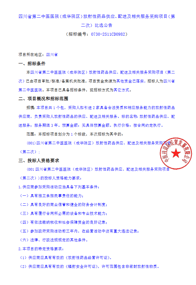 【四川省第二中医医院】四川省第二中医医院(成华院区)放射性药品供应、配送及相关服务采购项目(第二次)比选公告