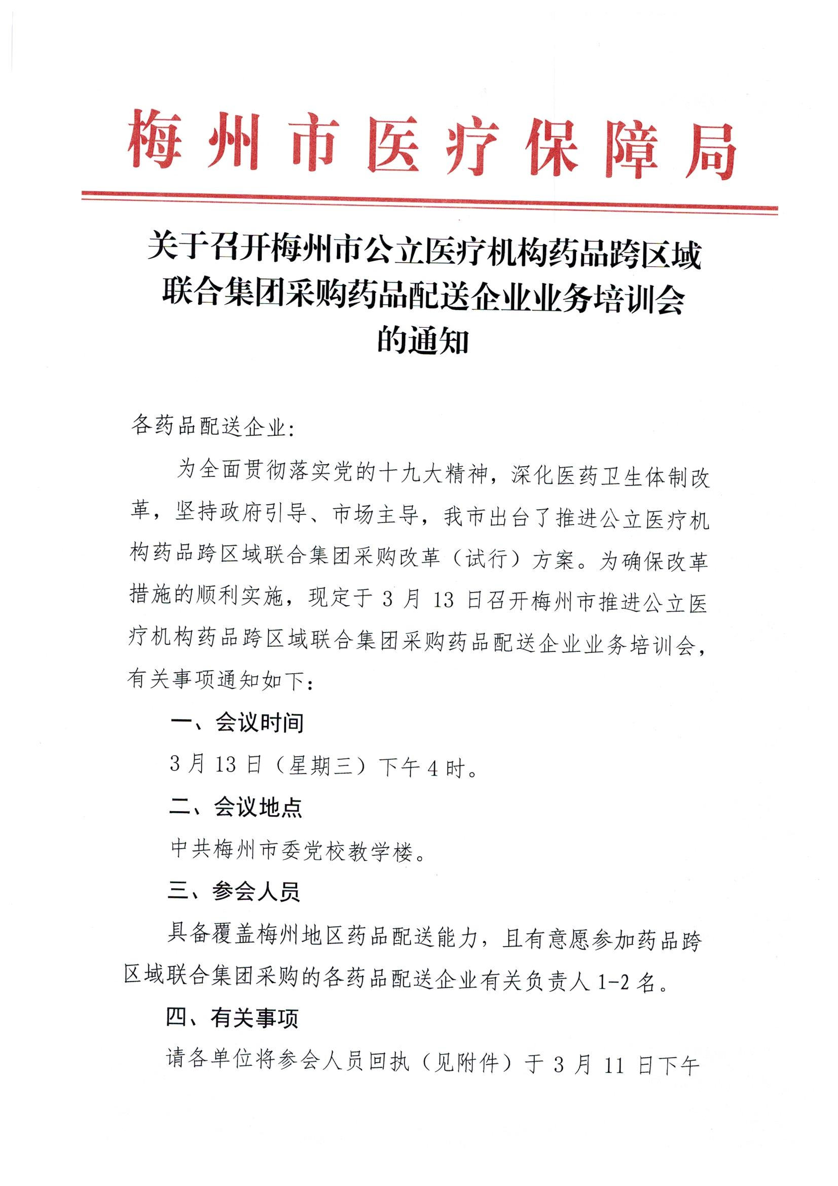 【梅州】全药网转发梅州医保局《关于召开梅州市公立医疗机构药品跨区域联合集团采购药品配送企业业务培训会的通知》