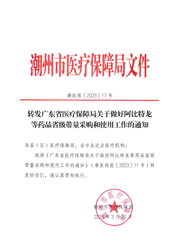 【潮州】潮医保〔2023〕17号 转发广东省医疗保障局关于做好阿比特龙等药品省级带量采购和使用工作的通知