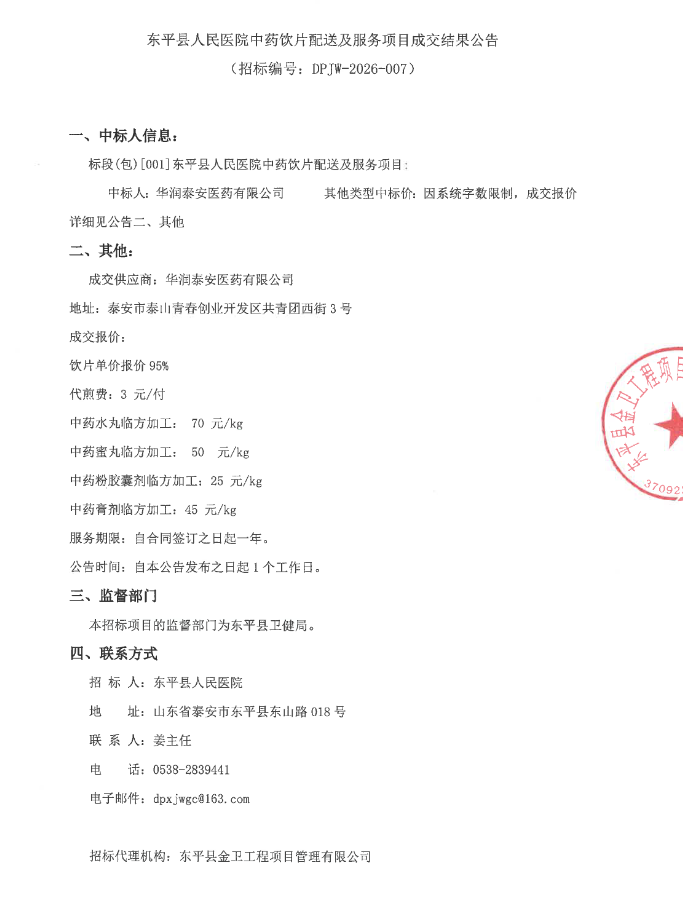 【泰安市东平县人民医院】山东省泰安市东平县人民医院中药饮片配送及服务项目成交结果公告
