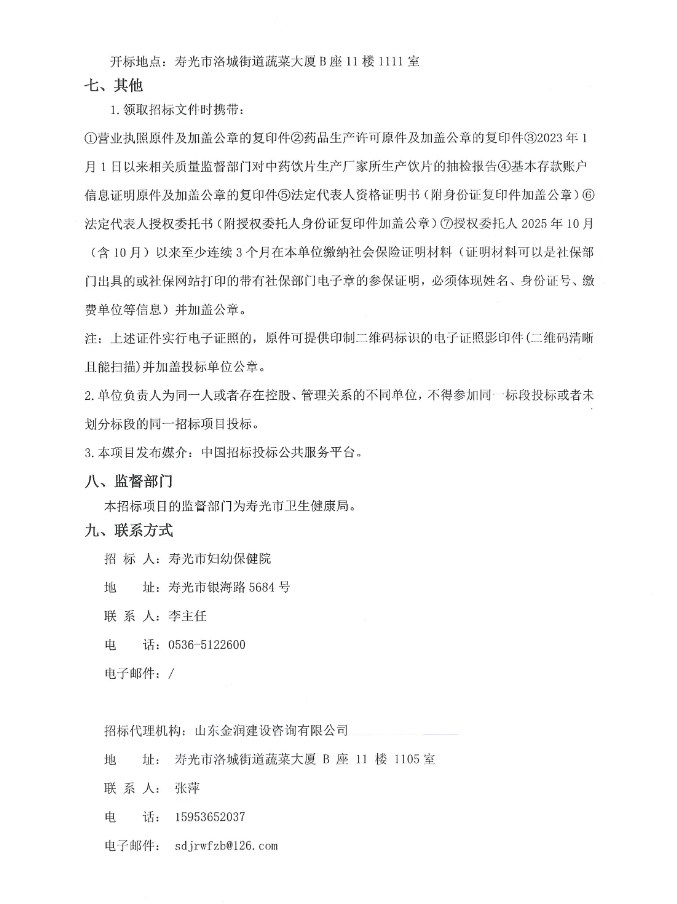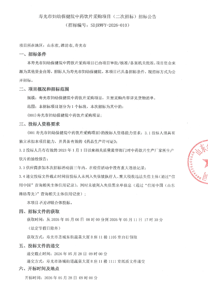 【潍坊市寿光市妇幼保健院】山东省潍坊市寿光市妇幼保健院中药饮片采购项目(二次招标)招标公告