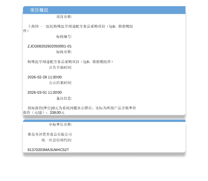 【上海四一一医院】上海四一一医院特殊医学用途配方食品采购项目(包8:脂肪酸组件)成交结果公示