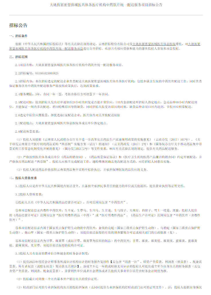 【楚雄彝族自治州大姚县紧密型县域医共体总医院】云南省楚雄彝族自治州大姚县紧密型县域医共体各医疗机构中药饮片统一配送服务项目招标公告