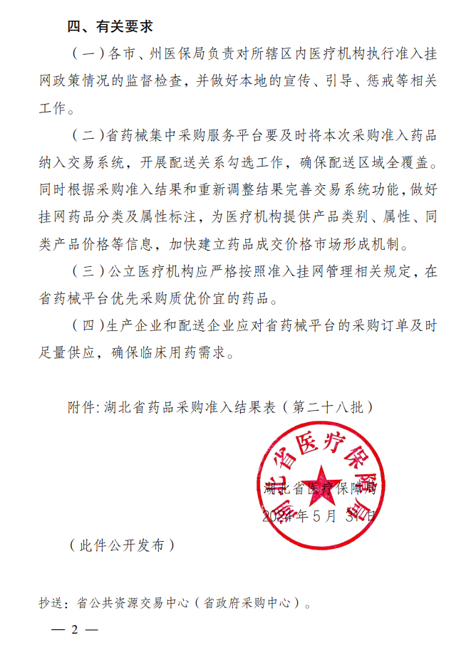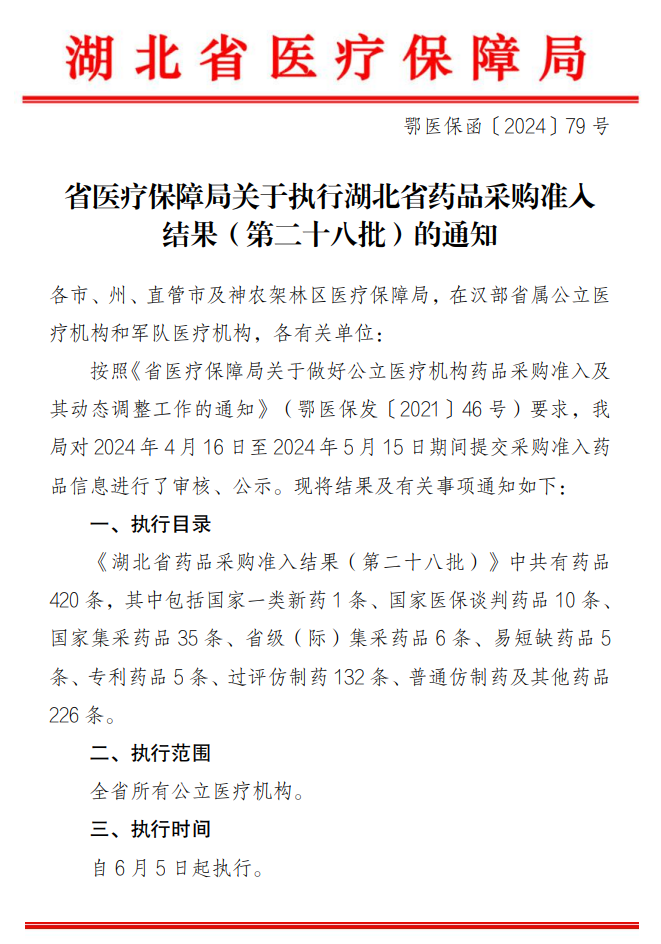 【鄂州】鄂医保函【2024】79号关于执行湖北省药品采购准入结果 (第二十八批)的通知