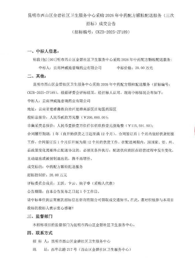 【昆明市西山区金碧社区卫生服务中心】云南省昆明市西山区金碧社区卫生服务中心采购2026年中药配方颗粒配送服务(三次招标)成交公告