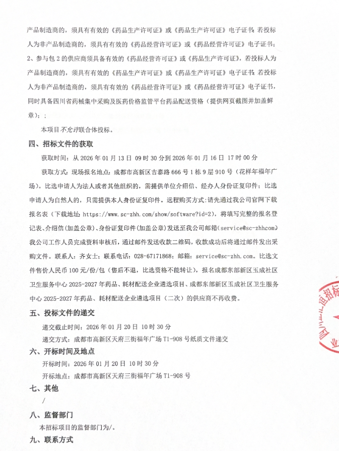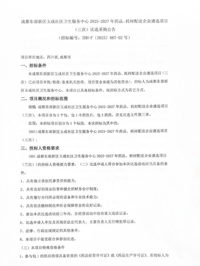 【成都东部新区玉成社区卫生服务中心】四川省成都东部新区玉成社区卫生服务中心2025-2027年药品、耗材配送企业遴选项目(三次)比选采购公告