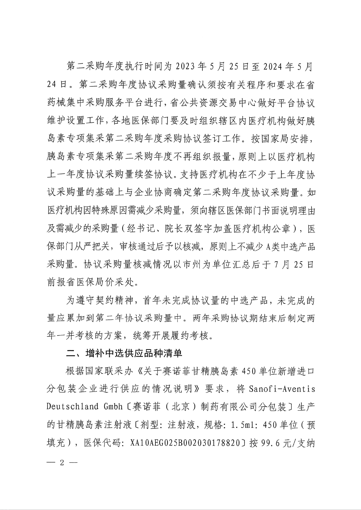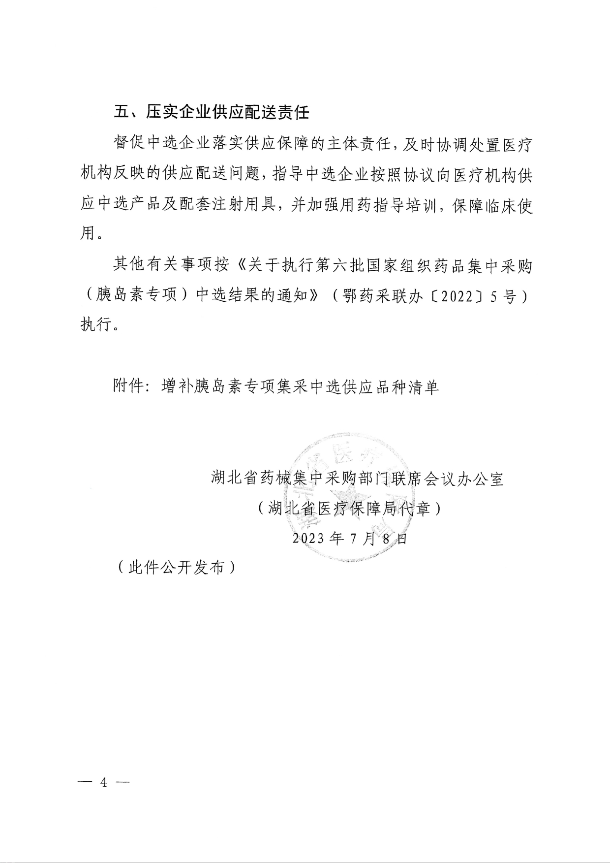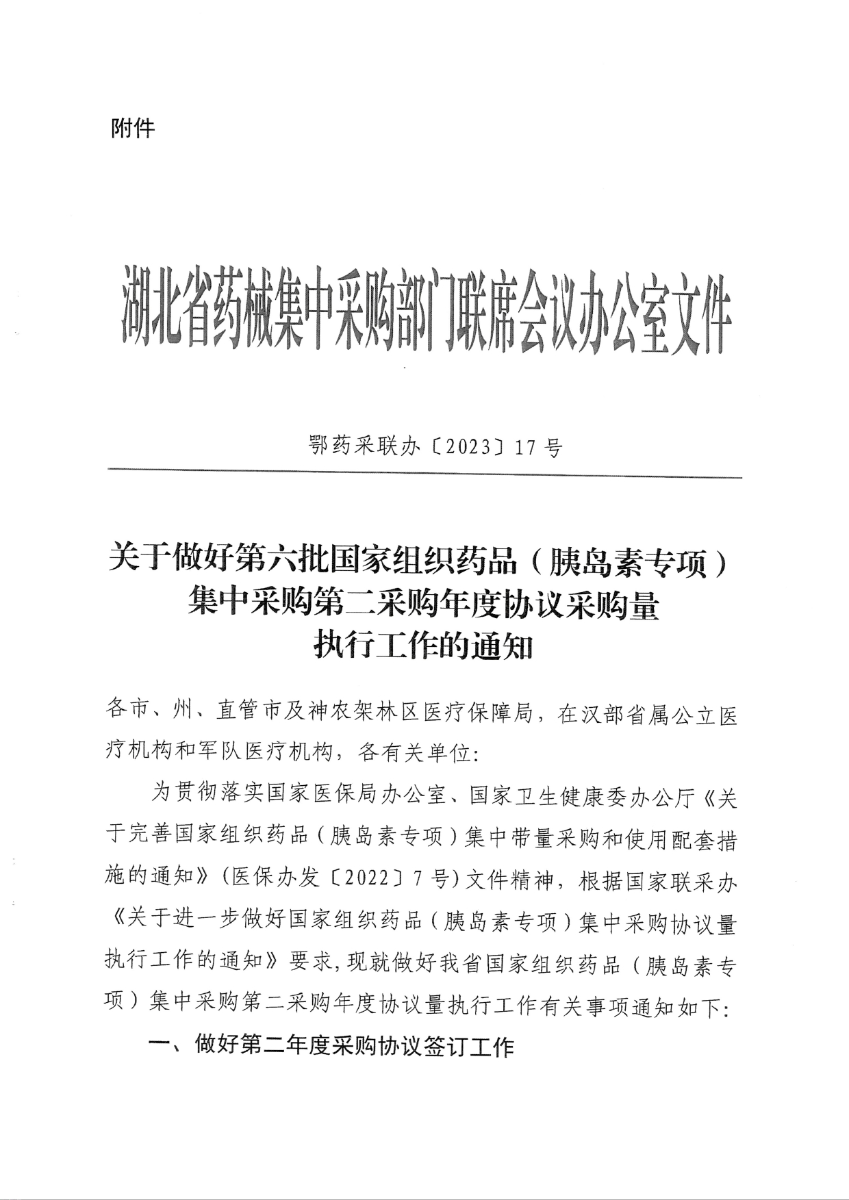 现将《关于做好第六批国家组织药品(胰岛素专项)集中采购第二采购年度协议采购量执行工作的通知》(鄂药采联办[2023] 17号)转发给你们,请结合本地实际遵照执行。