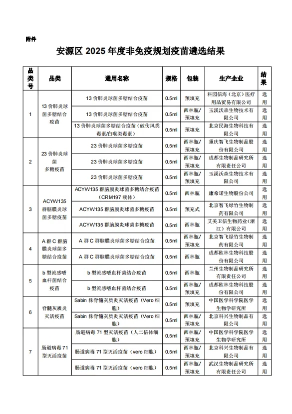 【萍乡】安源区2025年度非免疫规划疫苗遴选结果公示