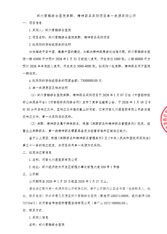 【郑州君鹏综合医院】河南省郑州君鹏综合医院麻醉、精神药品采购项目单一来源采购公示