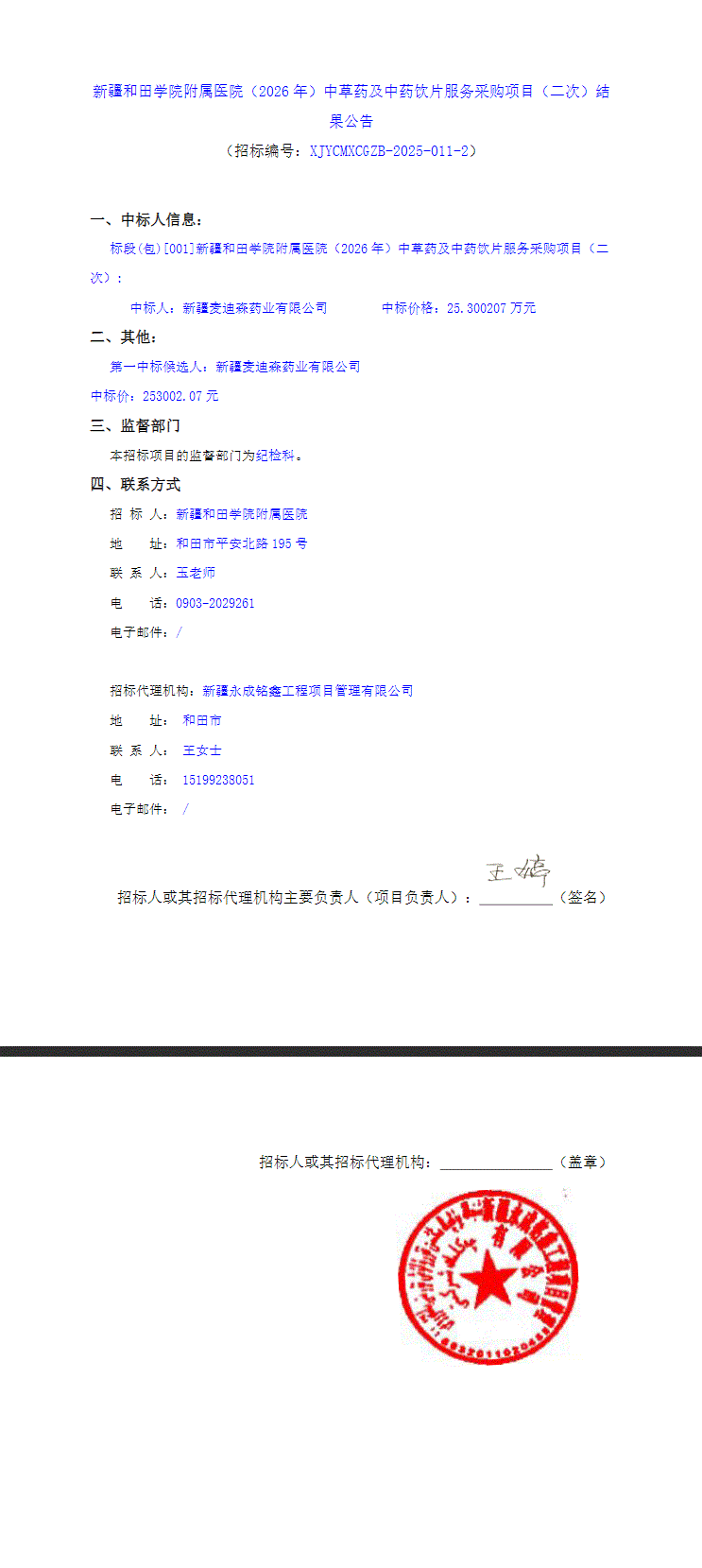 【新疆和田学院附属医院】新疆和田学院附属医院(2026年)中草药及中药饮片服务采购项目(二次)结果公告