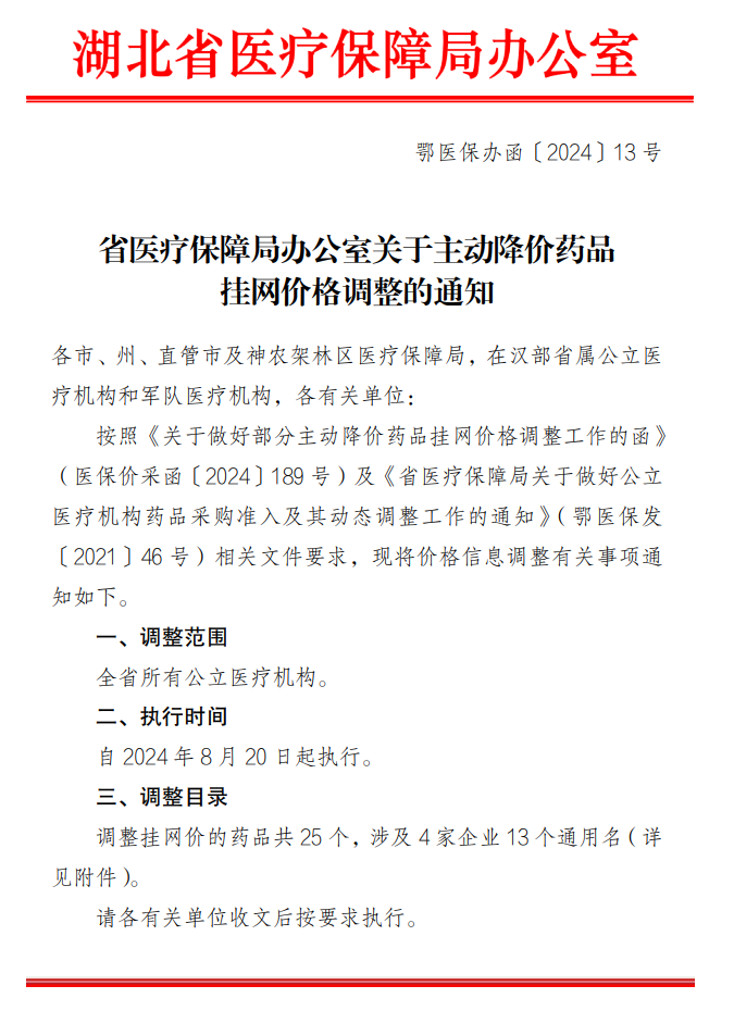 【鄂州】鄂医保办函〔2024〕13 号湖北省医疗保障局办公室关于主动降价药品挂网价格调整的通知