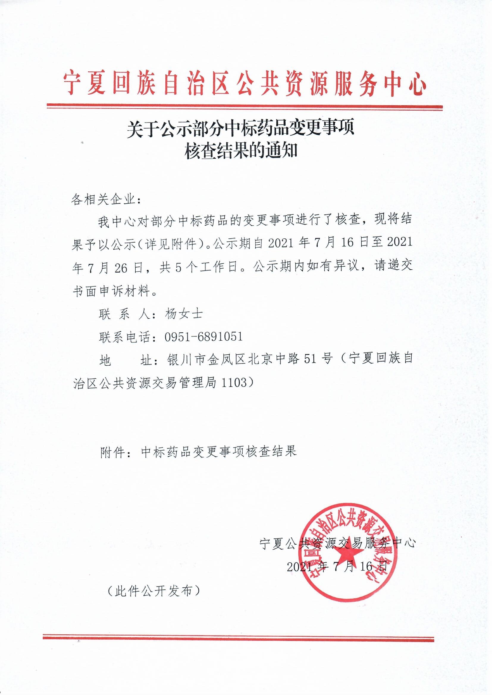 【宁夏】2021年宁夏自治区关于公示部分中标药品变更事项核查结果的通知