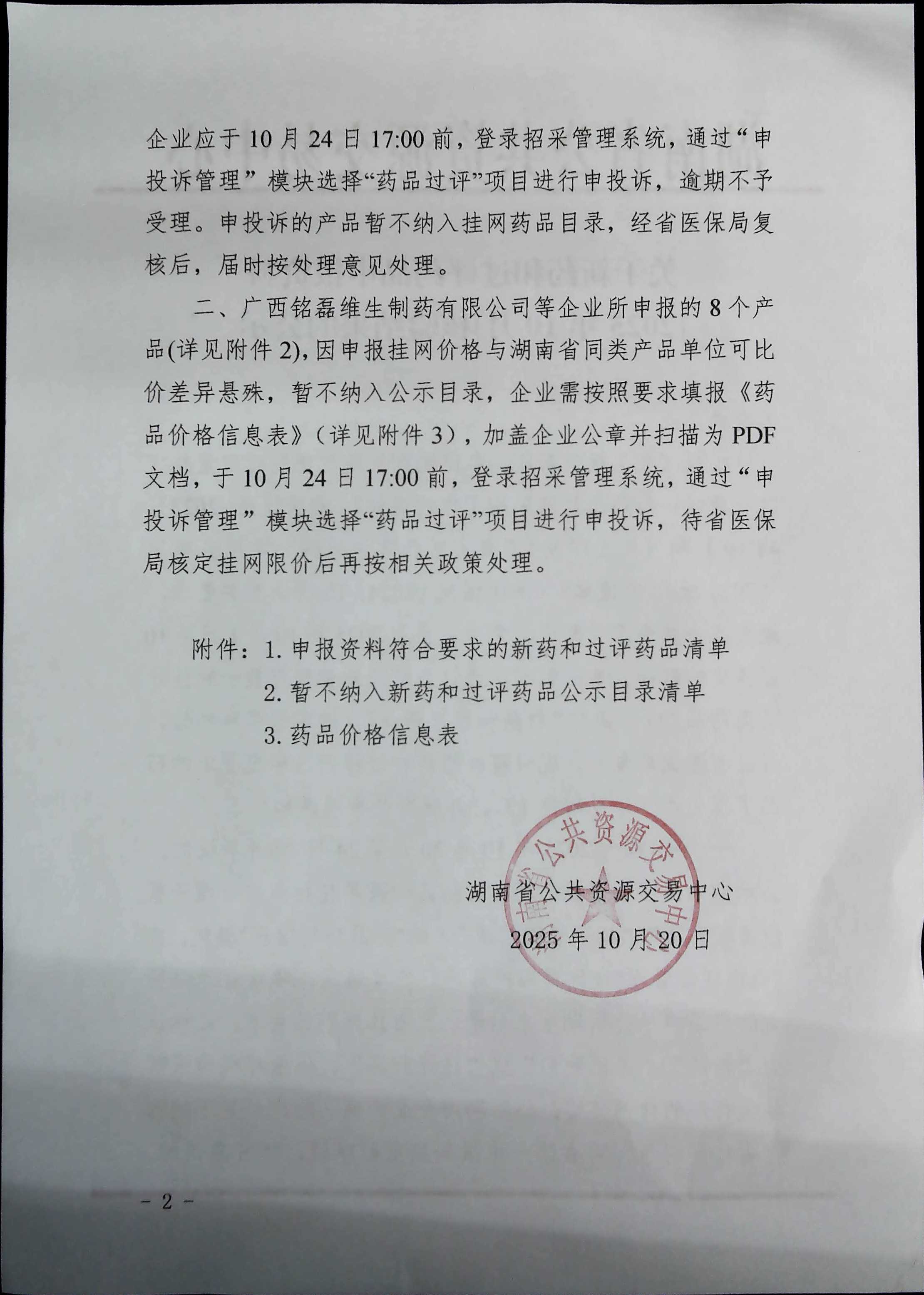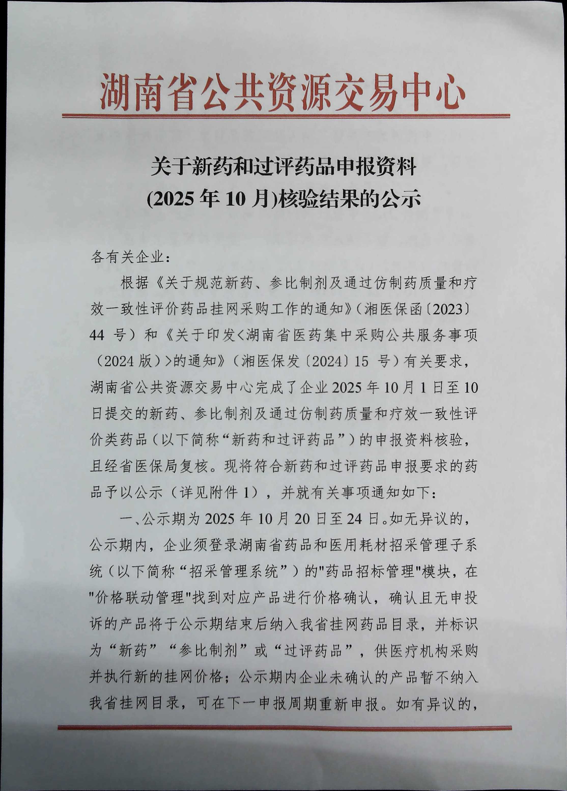 根据《关于规范新药、参比制剂及通过仿制药质量和疗效一致性评价药品挂网采购工作的通知》(湘医保函〔2023)44号)和《关于印发<湖南省医药集中采购公共服务事项(2024版)>的通知》(湘医保发〔2024〕15号)有关要求,湖南省公共资源交易中心完成了企业2025年10月1日至10日提交的新药、参比制剂及通过仿制药质量和疗效一致性评价类药品(以下简称“新药和过评药品”)的申报资料核验,且经省医保局复核。现将符合新药和过评药品申报要求的药品予以公示(详见附件1),并就有关事项通知如下: