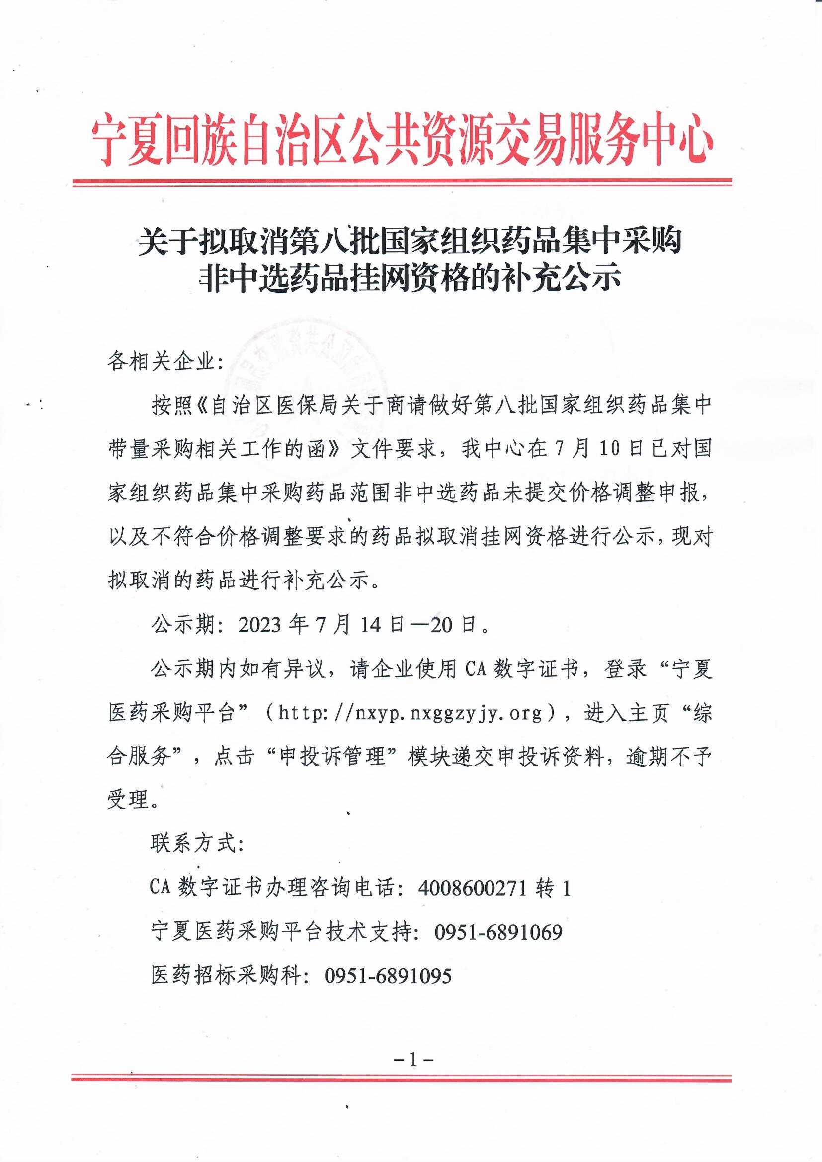 公示期内如有异议,请企业使用CA数字证书,登录“宁夏医药采购平台”(http://nxyp.nxggzyjy.org),进入主页“综合服务”,点击“申投诉管理”模块递交申投诉资料,逾期不予受理。