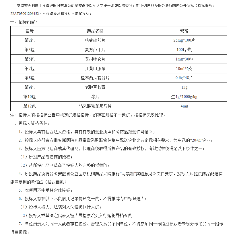 【安徽中医药大学第一附属医院】采购2022年部分药品(第一批)招标公告(二次)