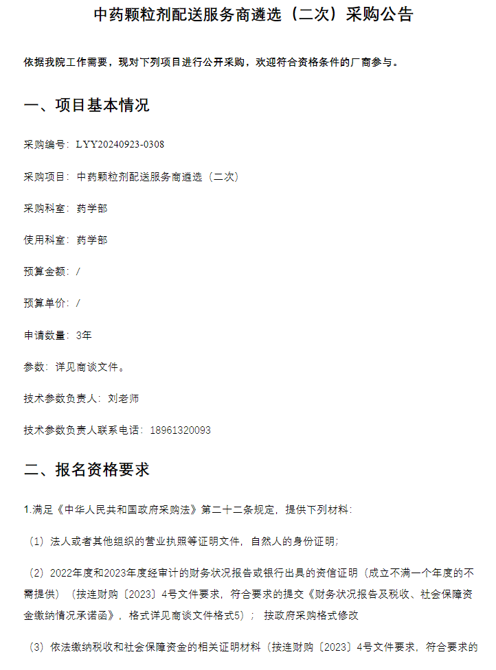 【连云港市第一人民医院】江苏省连云港市第一人民医院中药颗粒剂配送服务商遴选(二次)采购公告