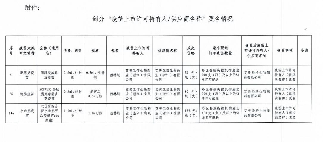 【福建】部分“疫苗上市许可持有人/供应商名称”更名情况