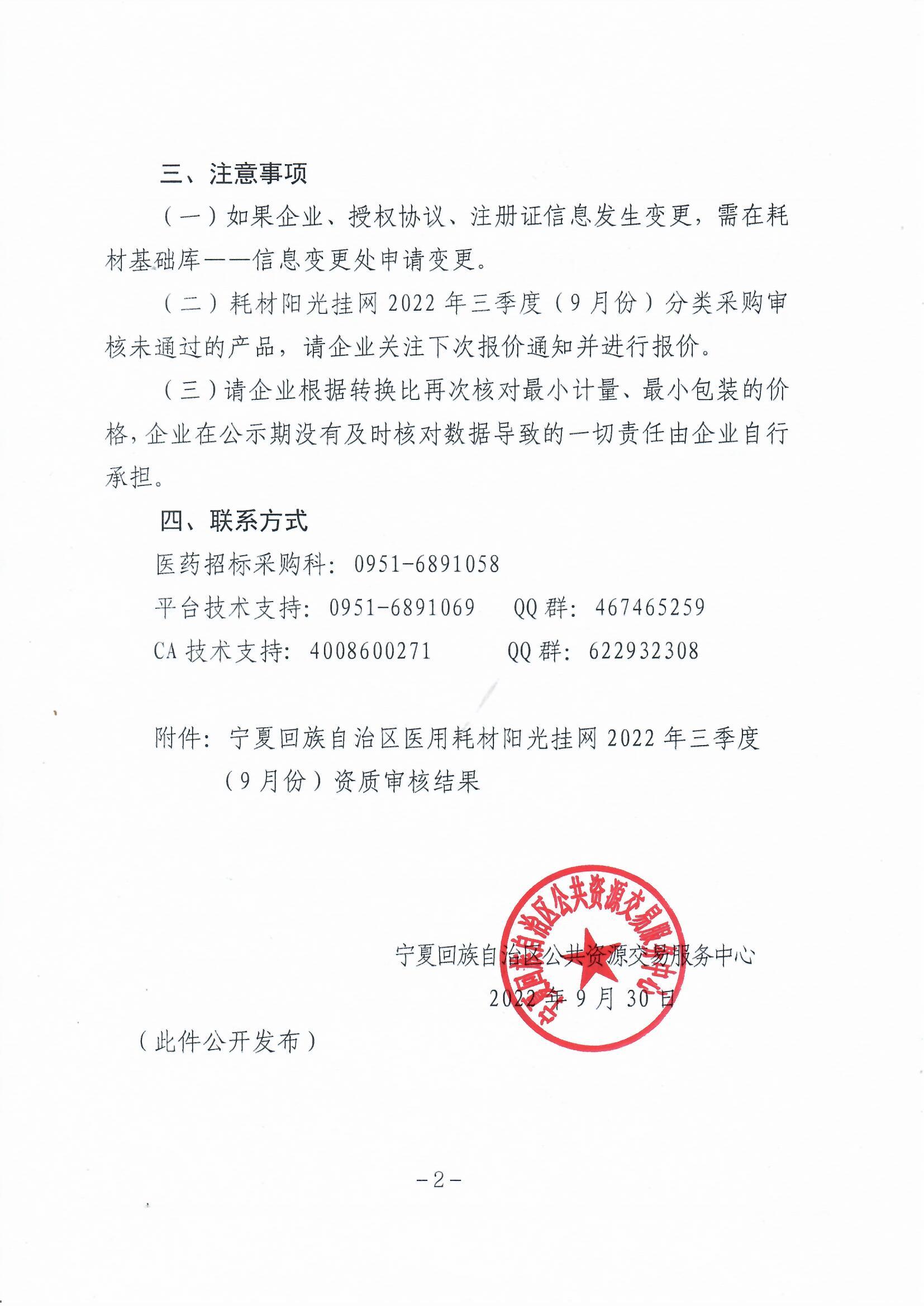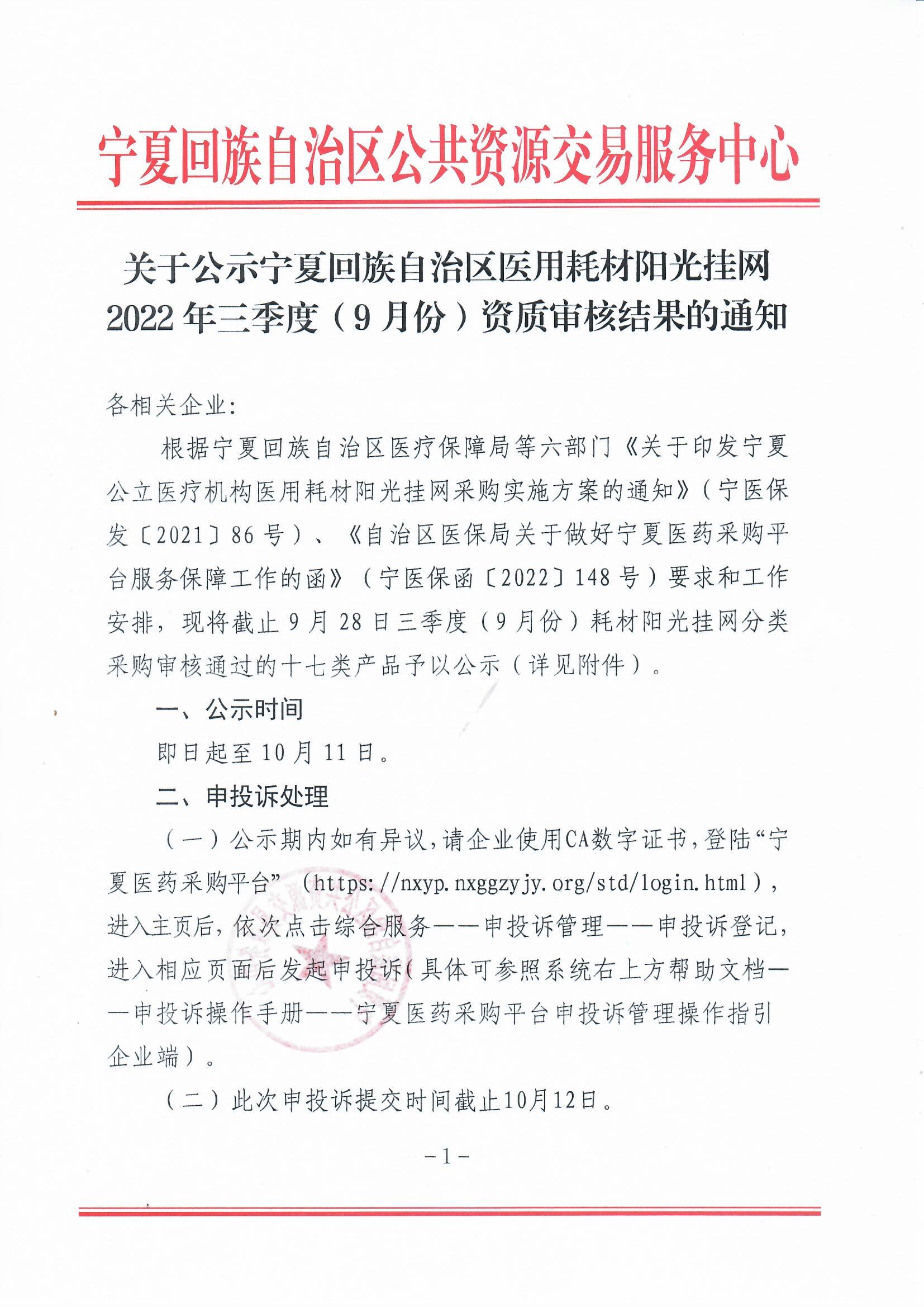 【宁夏】关于公示宁夏回族自治区医用耗材阳光挂网2022年三季度(9月份)资质审核结果的通知