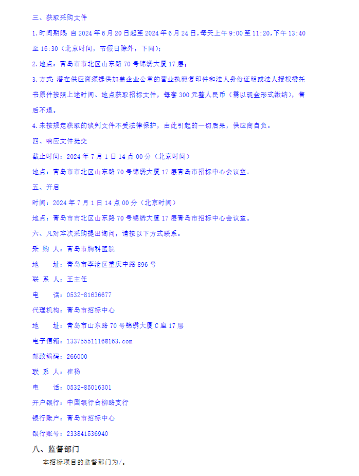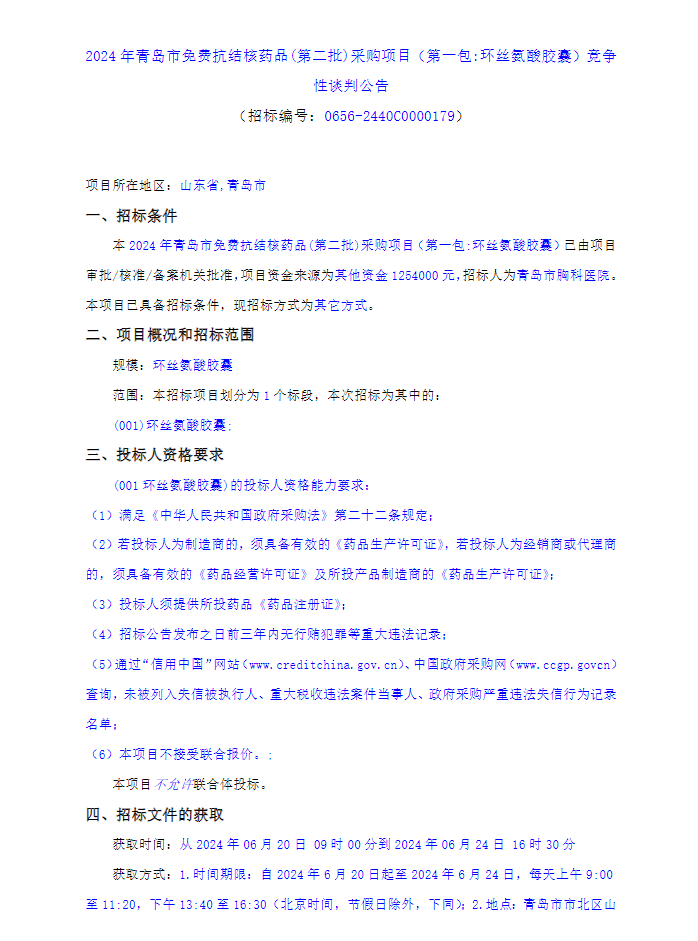 【青岛市胸科医院】山东省2024年青岛市免费抗结核药品(第二批)采购项目(第一包:环丝氨酸胶囊)竞争性谈判公告