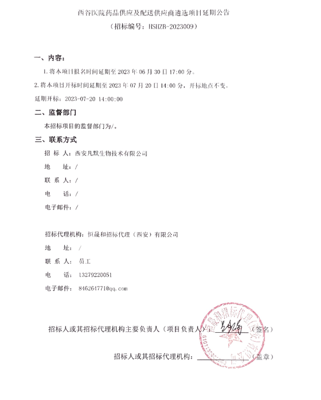 【西安市西谷医院】陕西省西安市西谷医院药品供应及配送供应商遴选项目延期公告