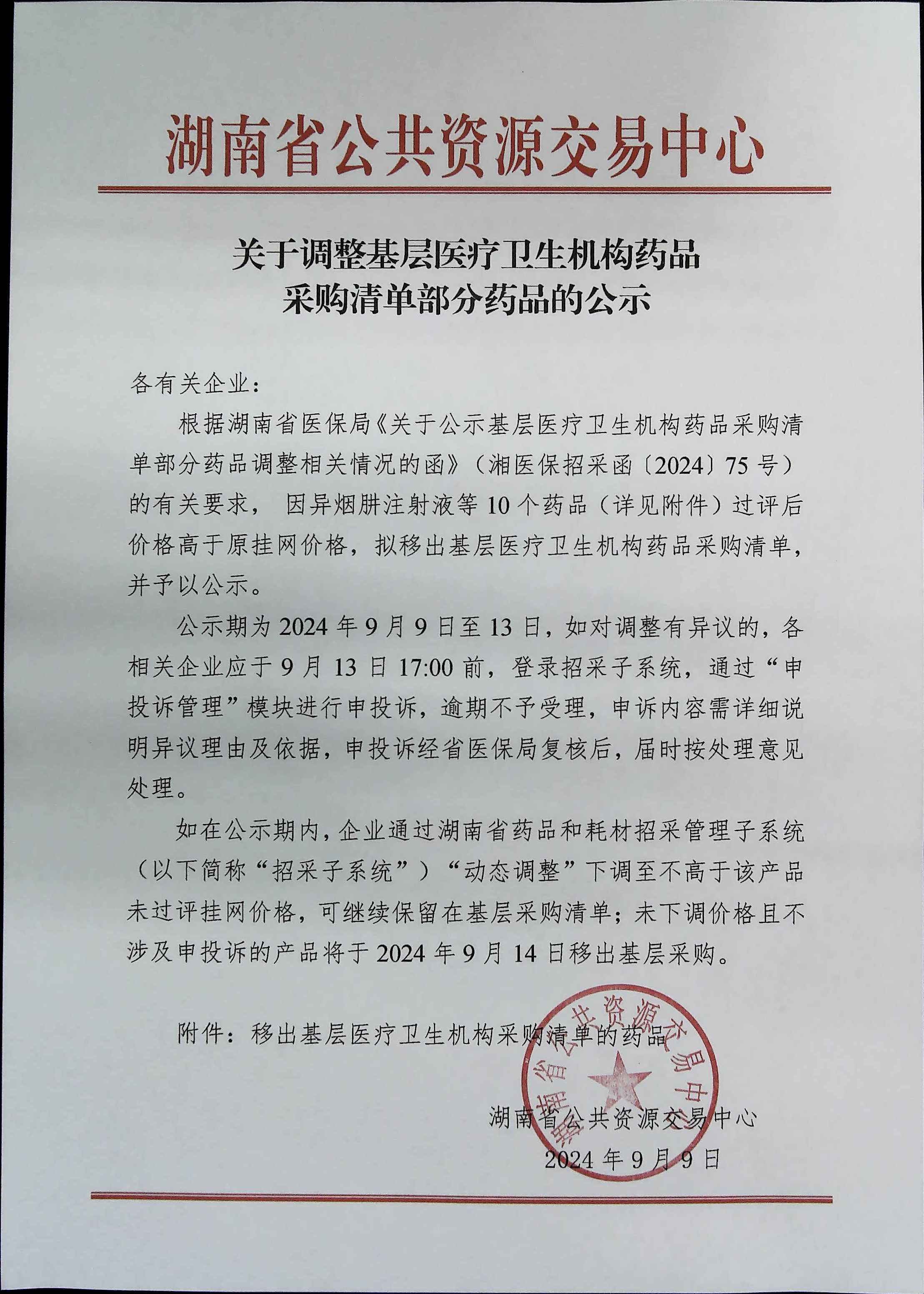 各有关企业: 根据湖南省医保局《关于公示基层医疗卫生机构药品采购清单部分药品调整相关情况的函》(湘医保招采函(2024)75号) 的有关要求,因异烟肼注射液等10个药品(详见附件)过评后价格高于原挂网价格,拟移出基层医疗卫生机构药品采购清单, 并予以公示。 公示期为2024年9月9日至13日,如对调整有异议的,各 相关企业应于9月13日17:00前,登录招采子系统,通过“申 投诉管理”模块进行申投诉,逾期不予受理,申诉内容需详细说明异议理由及依据,申投诉经省医保局复核后,届时按处理意见处理。 如在公示期内,企业通过湖南省药品和耗材招采管理子系统 (以下简称“招采子系统”)“动态调整”下调至不高于该产品 未过评挂网价格,可继续保留在基层采购清单;未下调价格且不 涉及申投诉的产品将于2024年9月14日移出基层采购。