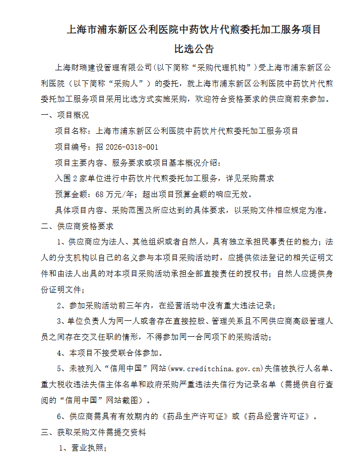 【上海市浦东新区公利医院】上海市浦东新区公利医院中药饮片代煎委托加工服务项目比选公告