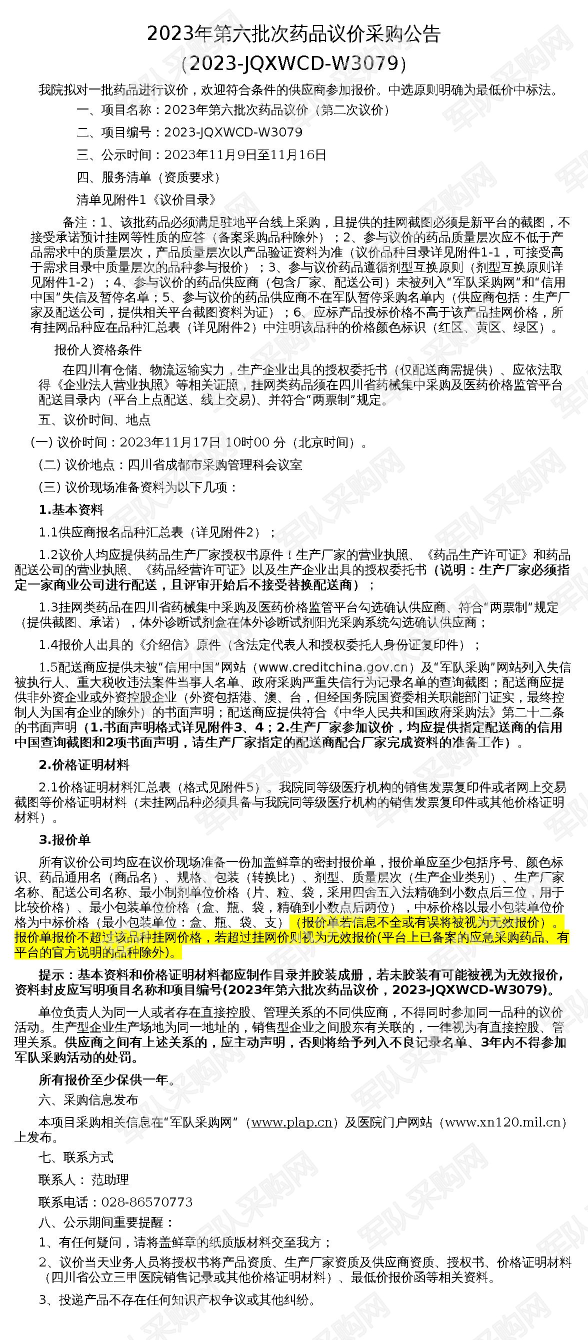 【军队采购】军队采购网2023年第六批次药品议价采购公告(2023-JQXWCD-W3079)(20231109)