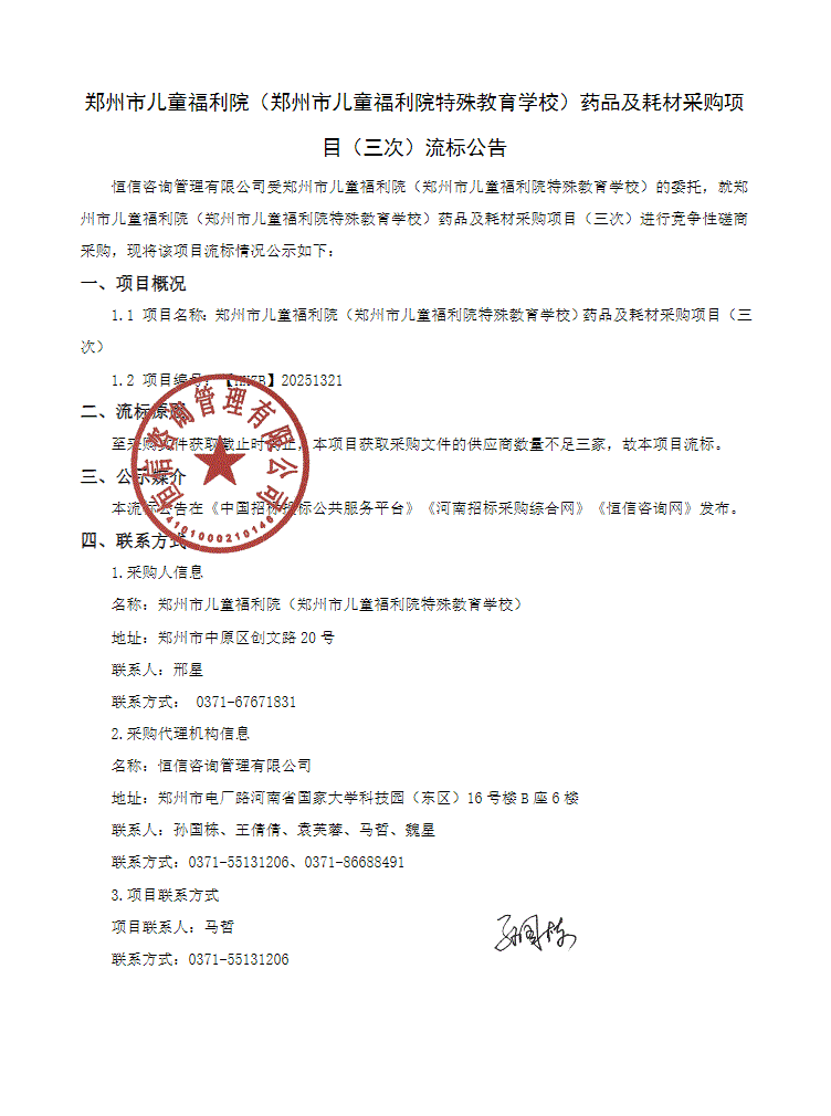 【郑州市儿童福利院】河南省郑州市儿童福利院(郑州市儿童福利院特殊教育学校)药品及耗材采购项目(三次)流标公告