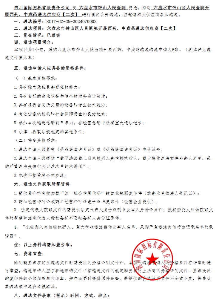 【六盘水市钟山区人民医院】贵州省六盘水市钟山区人民医院开展西药、中成药遴选供应商〔二次〕_遴选公告