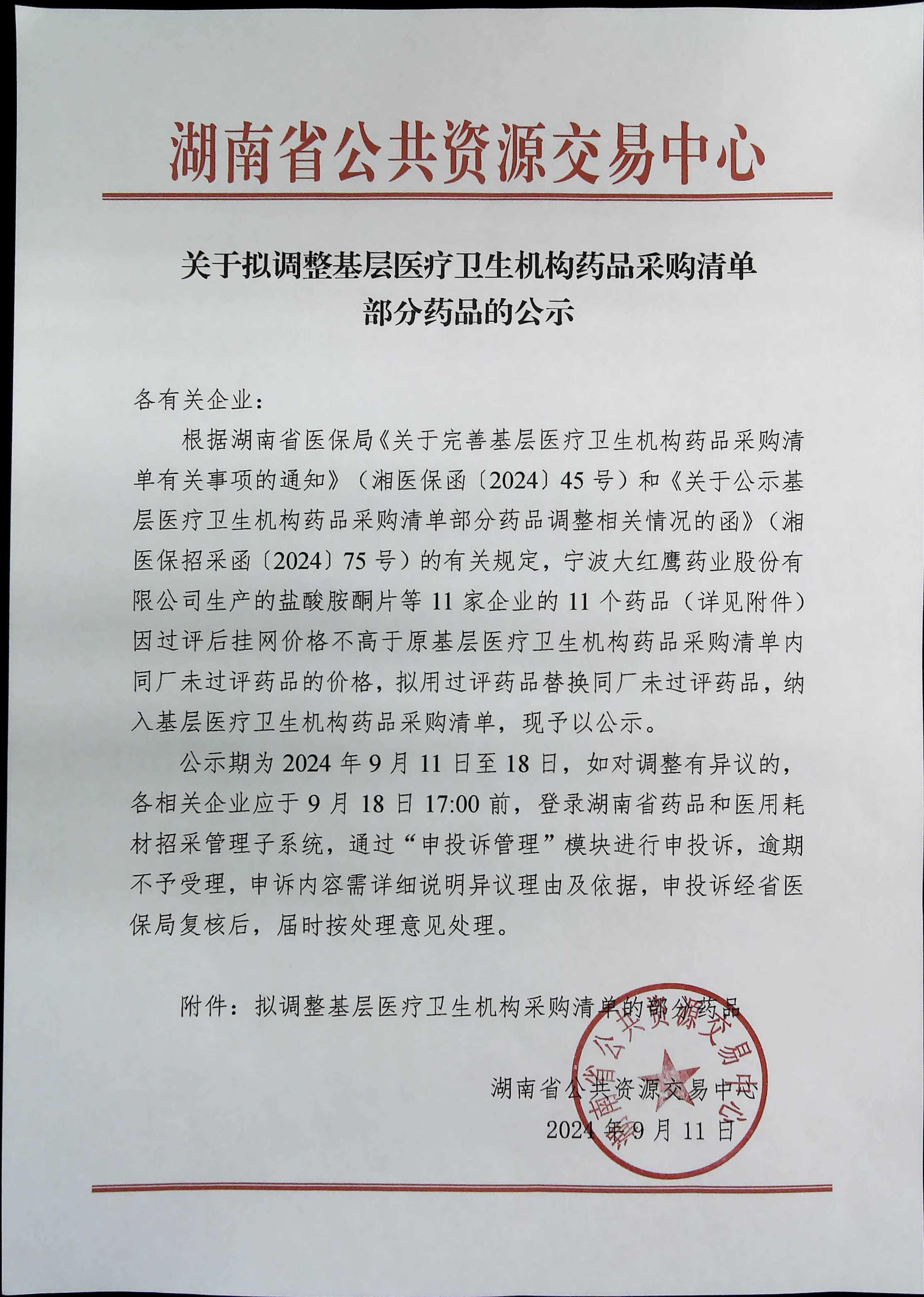 各有关企业: 根据湖南省医保局《关于完善基层医疗卫生机构药品采购清单有关事项的通知》(湘医保函(2024)45号)和《关于公示基层医疗卫生机构药品采购清单部分药品调整相关情况的函》(湘 医保招采函(2024〕75号)的有关规定,宁波大红鹰药业股份有 限公司生产的盐酸胺酮片等11家企业的11个药品(详见附件) 因过评后挂网价格不高于原基层医疗卫生机构药品采购清单内 同厂未过评药品的价格,拟用过评药品替换同厂未过评药品,纳入基层医疗卫生机构药品采购清单,现予以公示。 公示期为2024年9月11日至18日,如对调整有异议的,各相关企业应于9月18日17:00前,登录湖南省药品和医用耗 材招采管理子系统,通过“申投诉管理”模块进行申投诉,逾期不予受理,申诉内容需详细说明异议理由及依据,申投诉经省医保局复核后,届时按处理意见处理。