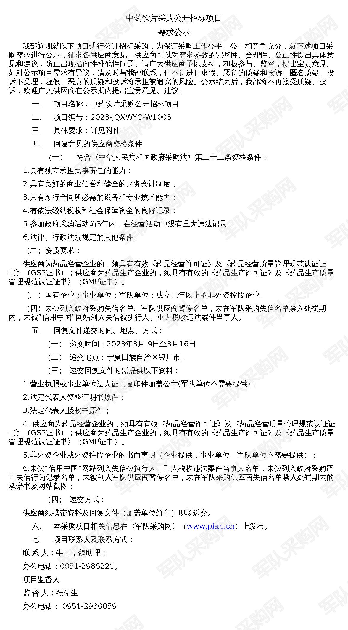 【军队采购】军队采购网中药饮片采购公开招标项目需求公示(2023-JQXWYC-W1003)